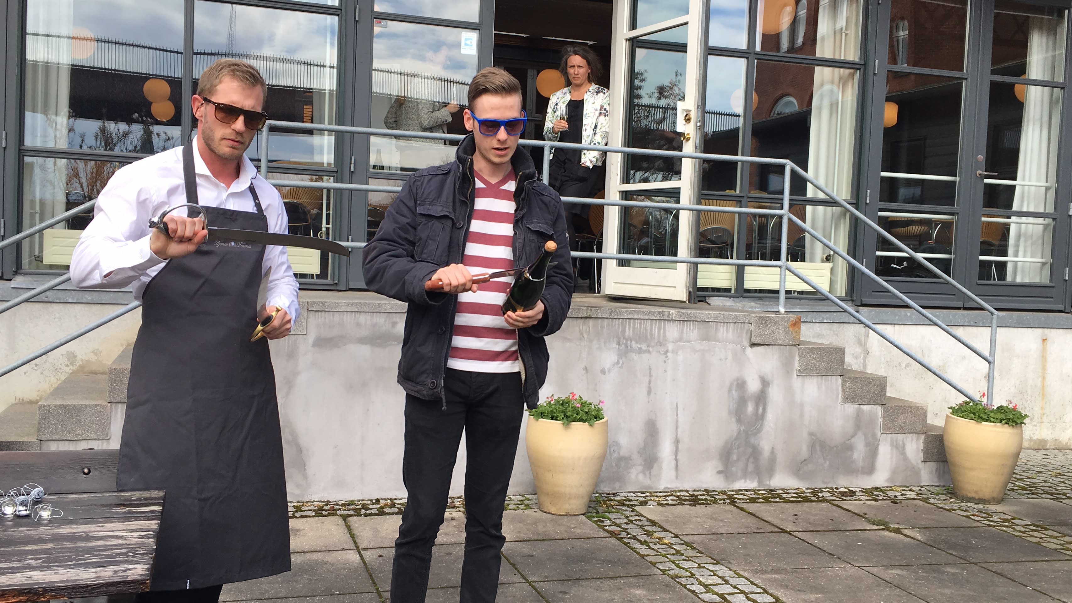 Smager på 2 flasker og sabler 1 flaske hver.
