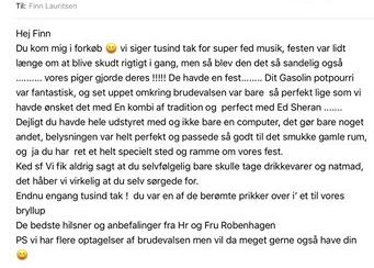 Tak for et super godt input til min fest. Der er ingen tvivl om, at det satte prikken over i'et. Du leverede varen som jeg havde ønsket det, dansegulvet var på intet tidspunkt tomt og jeg svingede selv rundt til stort set samtlige numre.