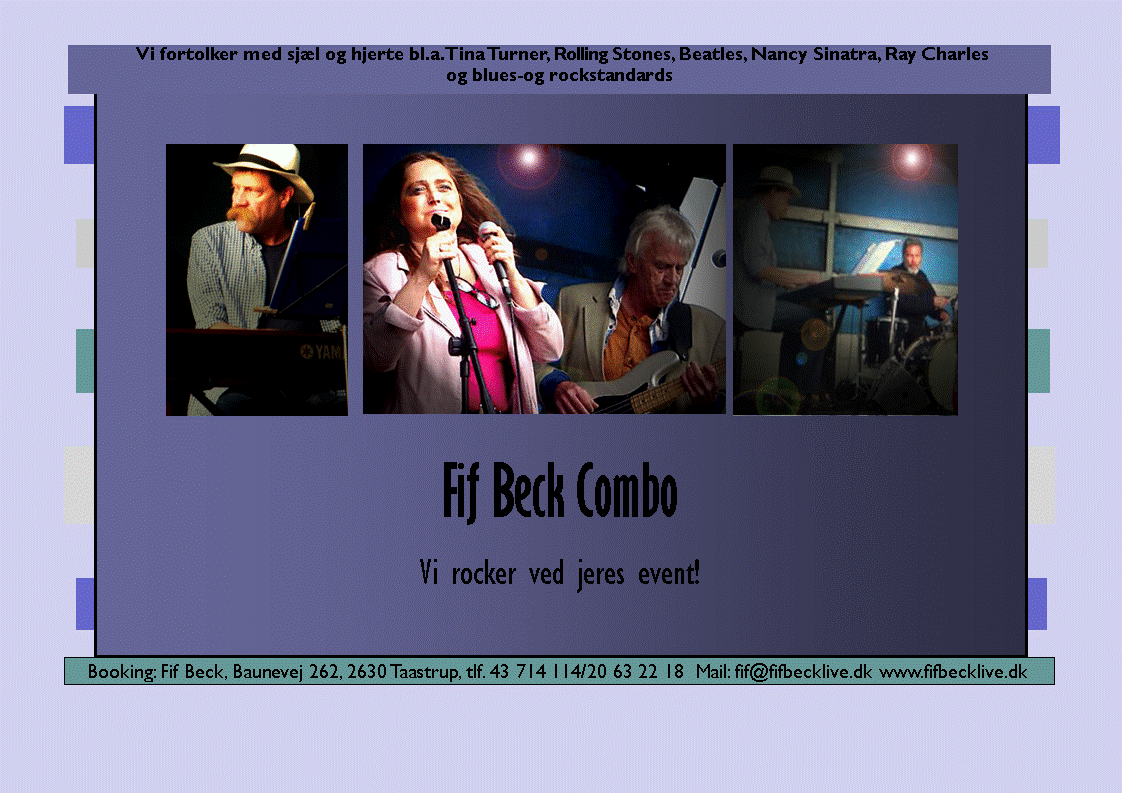 Skal jeres arrangement være en succes, skal I have levende - rigtig levende musik. Fif Beck Combo rocker ved jeres arrangement. Energi, nerve, intensitet og frem for alt stinkende musikalsk underholdning med en sprudlende sangerinde og 3 professionelle, drevne, musikalske rotter bag instrumenterne.