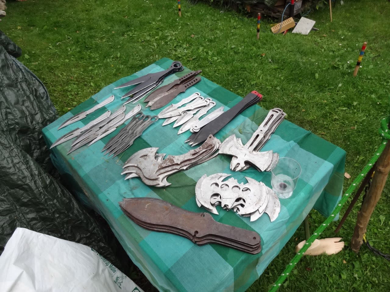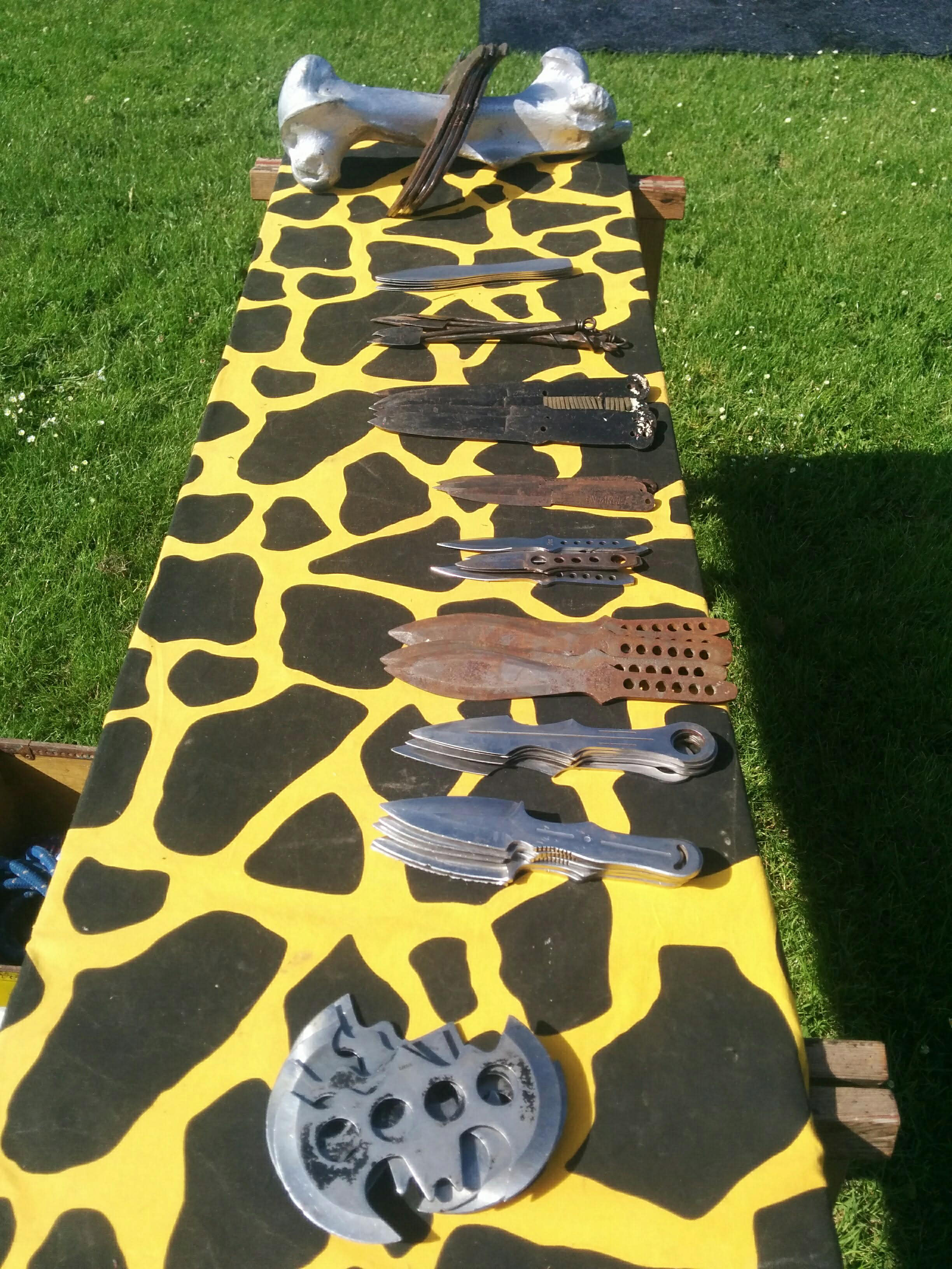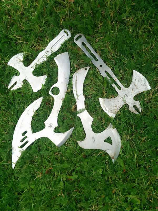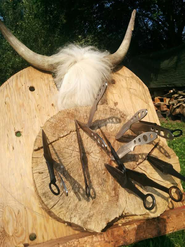Alle kasteknive og økser er af metal og originale. Der er ingen risiko, for at skære sig.