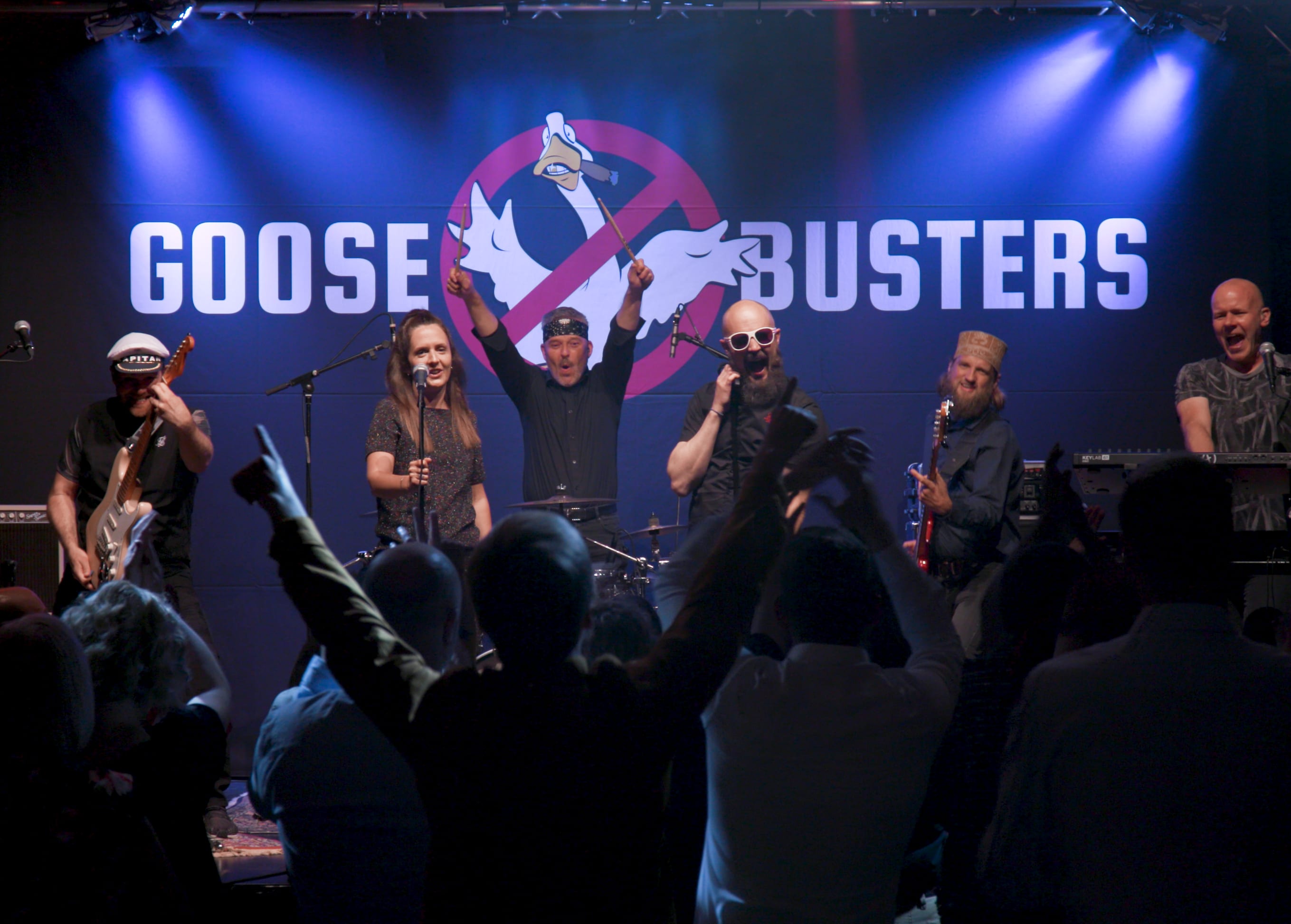 Goosebusters drives frem af en sand energibombe på vokal - Jens Green-Schilberg, som i 00'erne blev landskendt blandt P3´s lyttere for at have det mest julede kælenavn, 'Gåsen'. Når først 'Gåsen' går på, er der dog langt fra de brunede kartofler og den tunge sovs til det festfyrværkeri af delikate musikalske retter der professionelt serveres langt udover scenekanten af Goosebusters. Bandets musikere har solid erfaring fra andre sammenhænge og matcher 'Gåsens' energi med spilleglæde og veloplagthed.