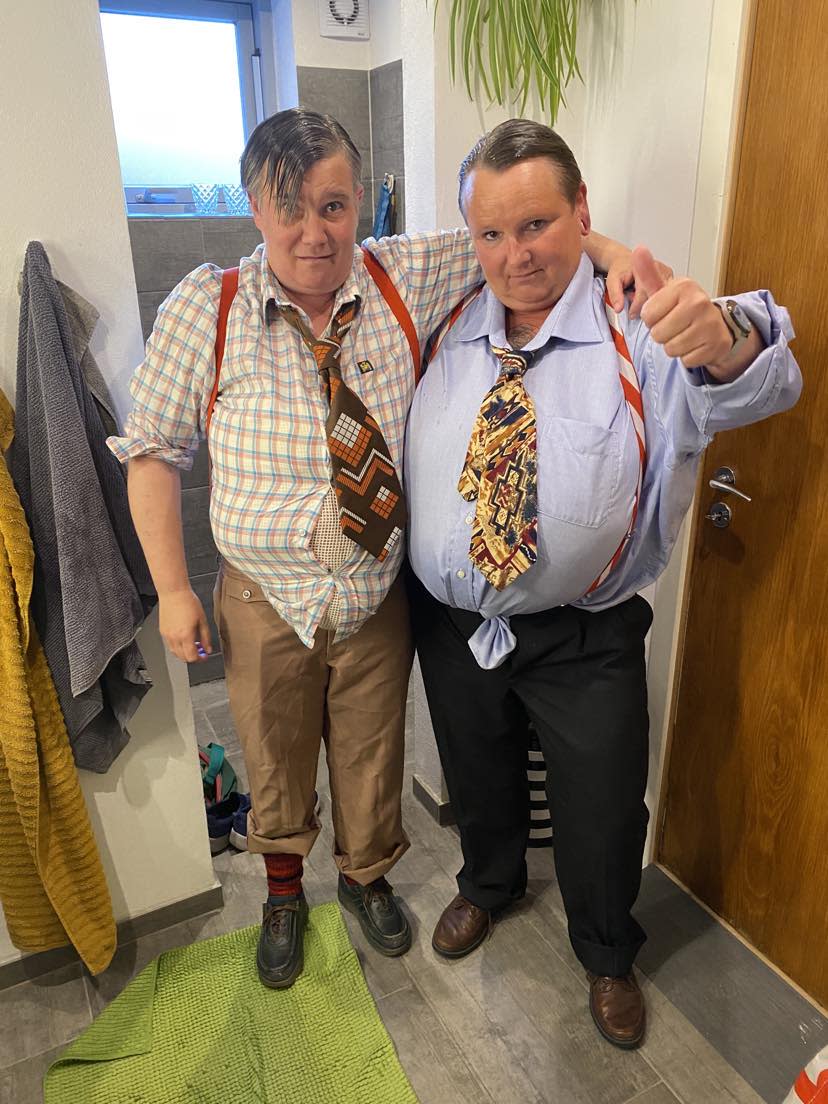 To jyske gutter (i virkeligheden to kvindfolk i forklædning 😉) kommer og sætter gang i festen med en mundfuld humor, en bajer i hånden og masser af kærlig drilleri.