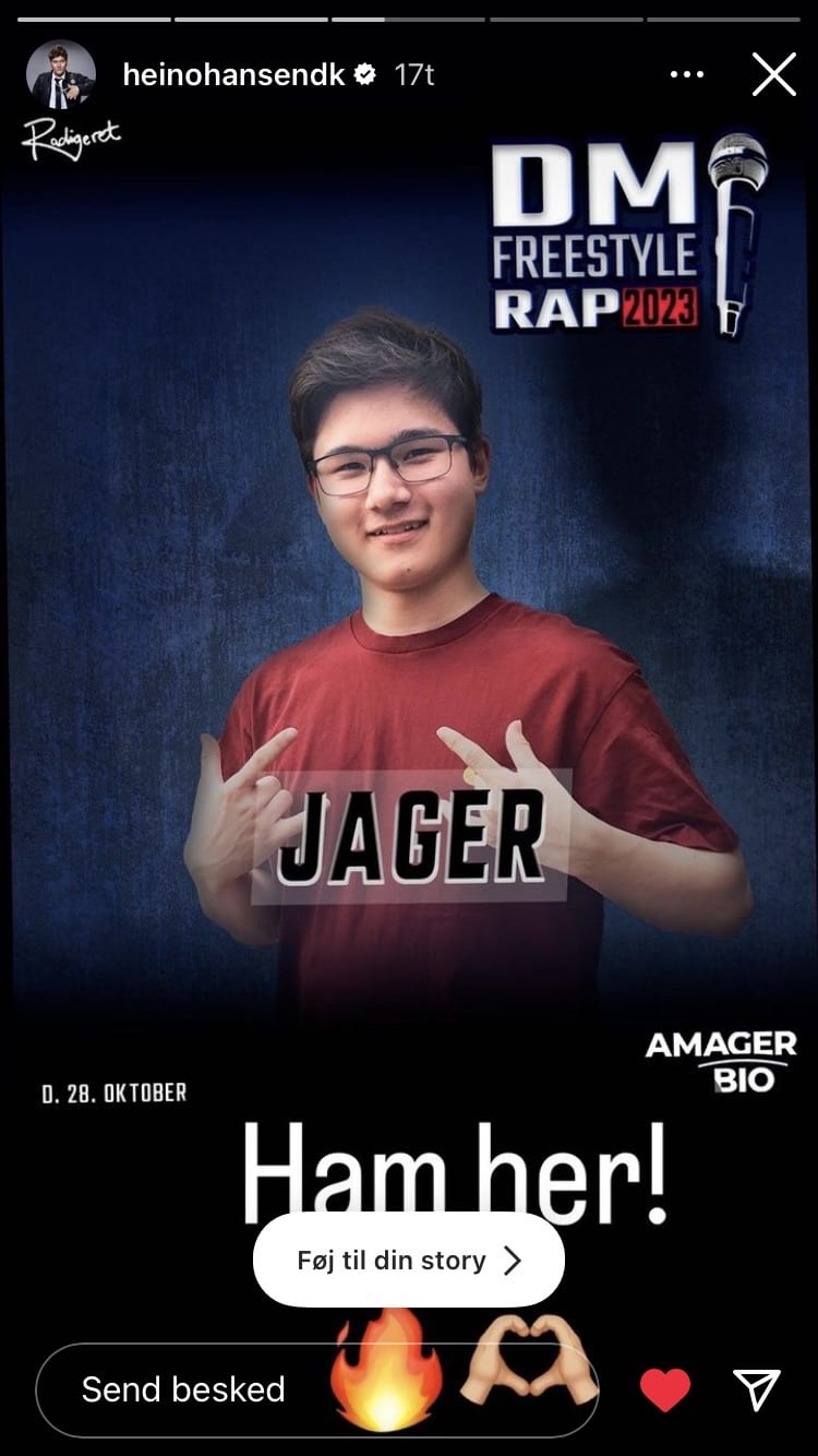 Jager er 20 år, kommer fra Svendborg og har til dagligt sabbatår. Han har freestylerappet i 8 år og har optrådt på scenen siden 2022, hvor han debuterede til DM i Freestyle Rap 2022. Derudover har han kvalificeret sig til DM i Freestyle Rap 2023, 2024 og 2025, hvor han blev nr. 2 ved kvalifikationsturneringen i København (2024). 🇩🇰
