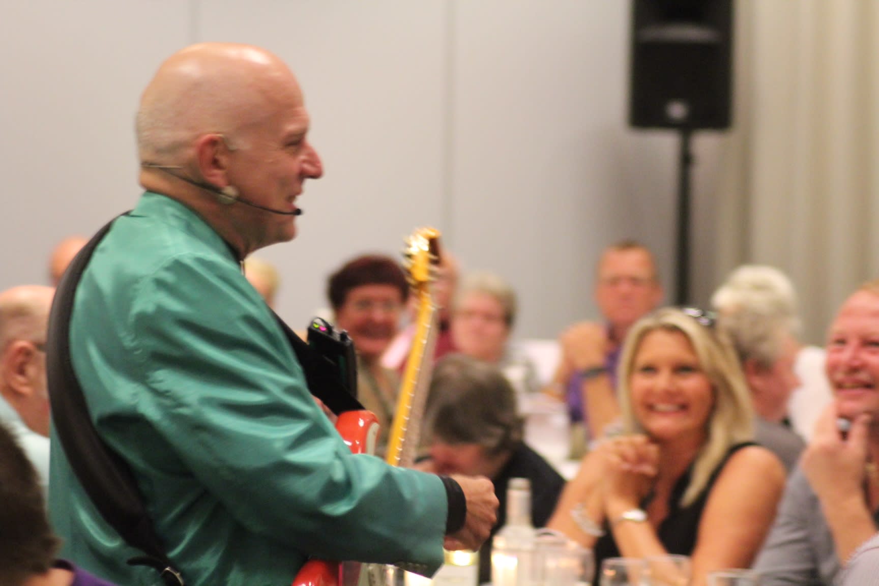 Han medbringer, udover sit keyboard, trådløs guitar og trådløs mikrofon således, at han mellem hovedret og dessert kan lave et underholdningsindslag, hvor han går rundt ved bordet/bordene. Dette show skaber virkelig stemning.