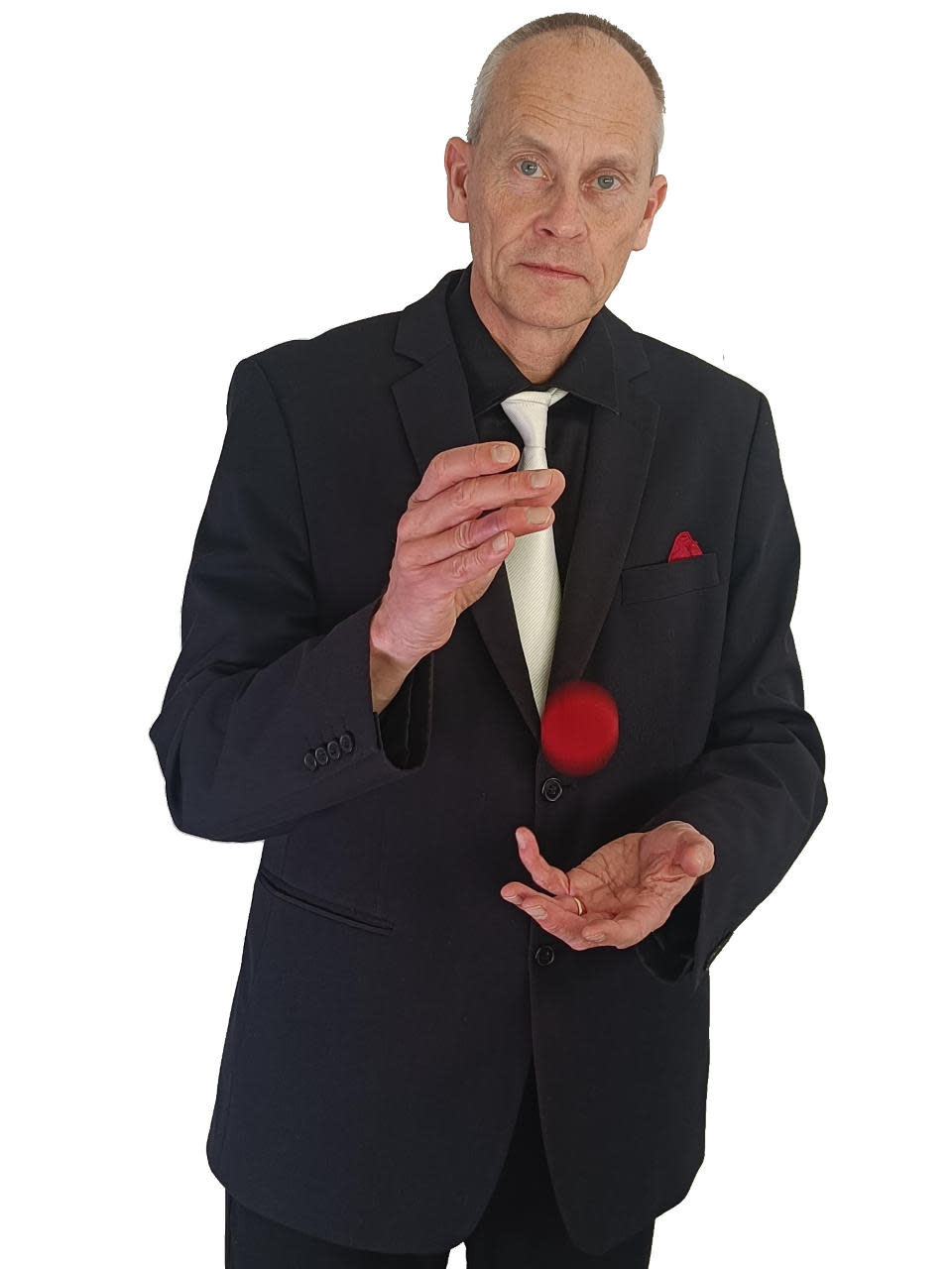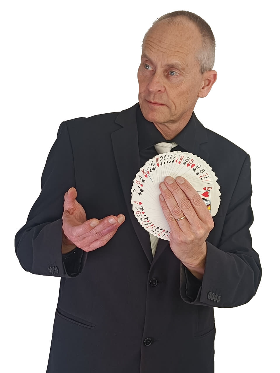 Med min underspillede humor går trylleriet rent ind hos alle. Jeg tryller naturligvis med kort, det forventer vi jo allesammen af en tryllekunstner, og der er så mange muligheder for at bygge historier ind. Men jeg kan også godt lide at blande helt andre ting ind i trylleriet, så det bliver til magi, tankelæsning, forudsigelser og umuligheder med reb, peberfrugter, slips - og publikum selv.