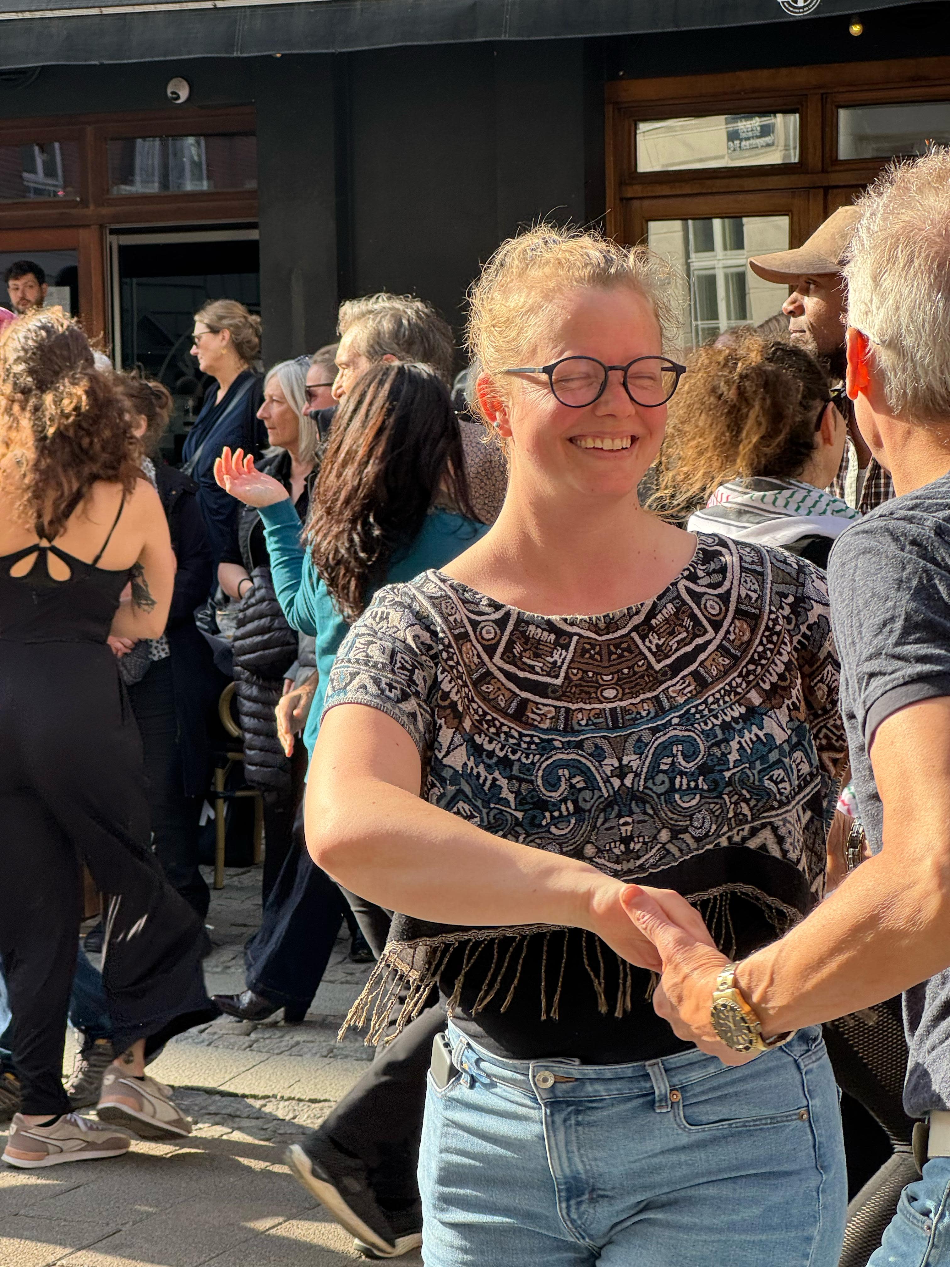 Med den hyggelige og varme stemning Mette skabte havde alle lyst til at deltage. Det var perfekt at hun kom med egen soundbox, udstyr og musik. Mette var god til at vise trin, der passede til niveauet - også med et meget blandet publikum - krydret med anekdoter om Costa Rica og dansens historie.