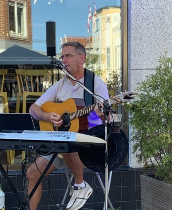 Med akustisk guitar og sang - samt et forprogrammeret Keyboard.