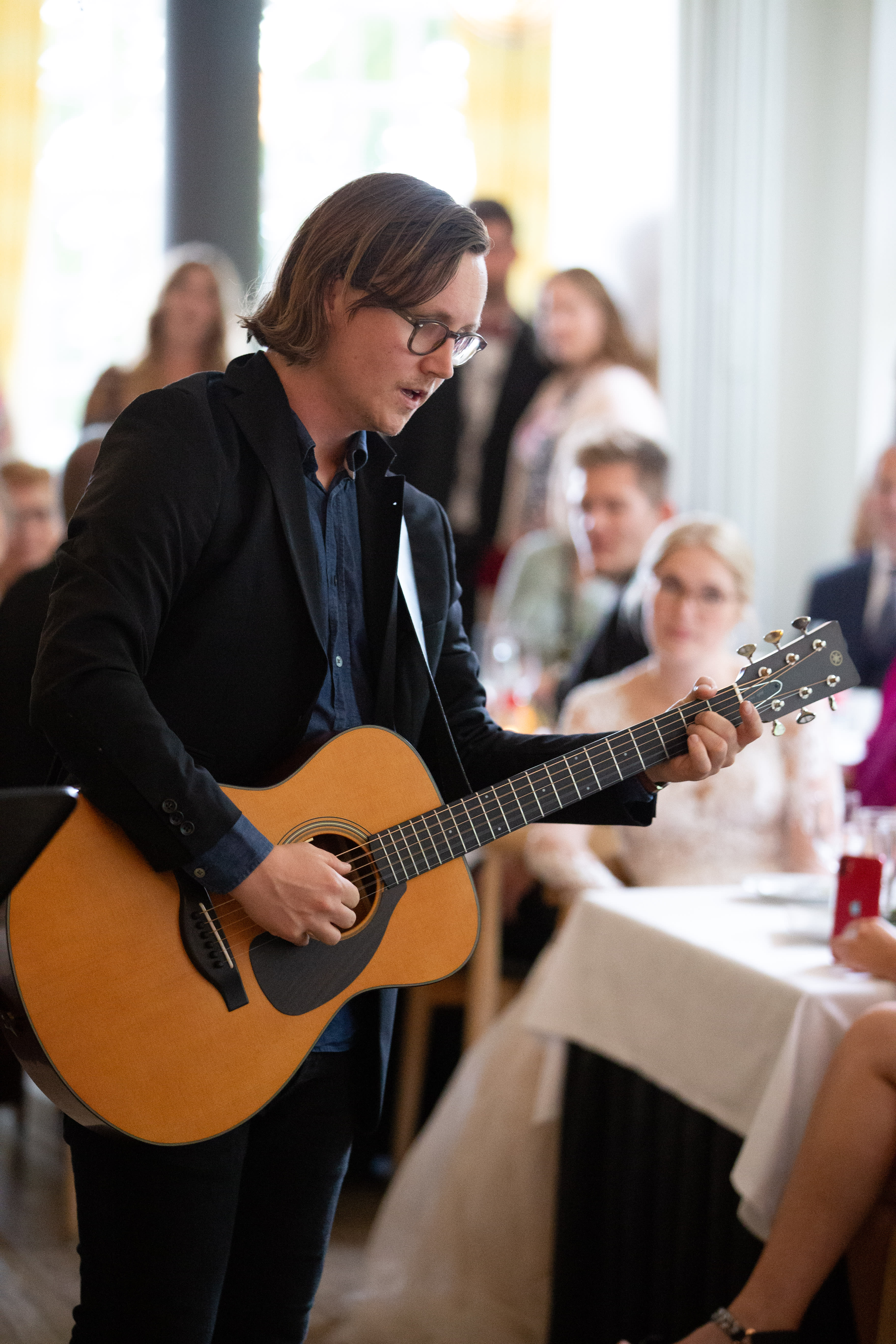 Mikkel Julius spillede, mens gæsterne ankom til vores jubilæum og mens vi spiste middagen. Mikkel havde en fin fornemmelse af stemning, så han vekslede mellem stille musik i baggrunden, pauser mens der blev holdt taler, og var direkte på, da det skulle synges fællessang.