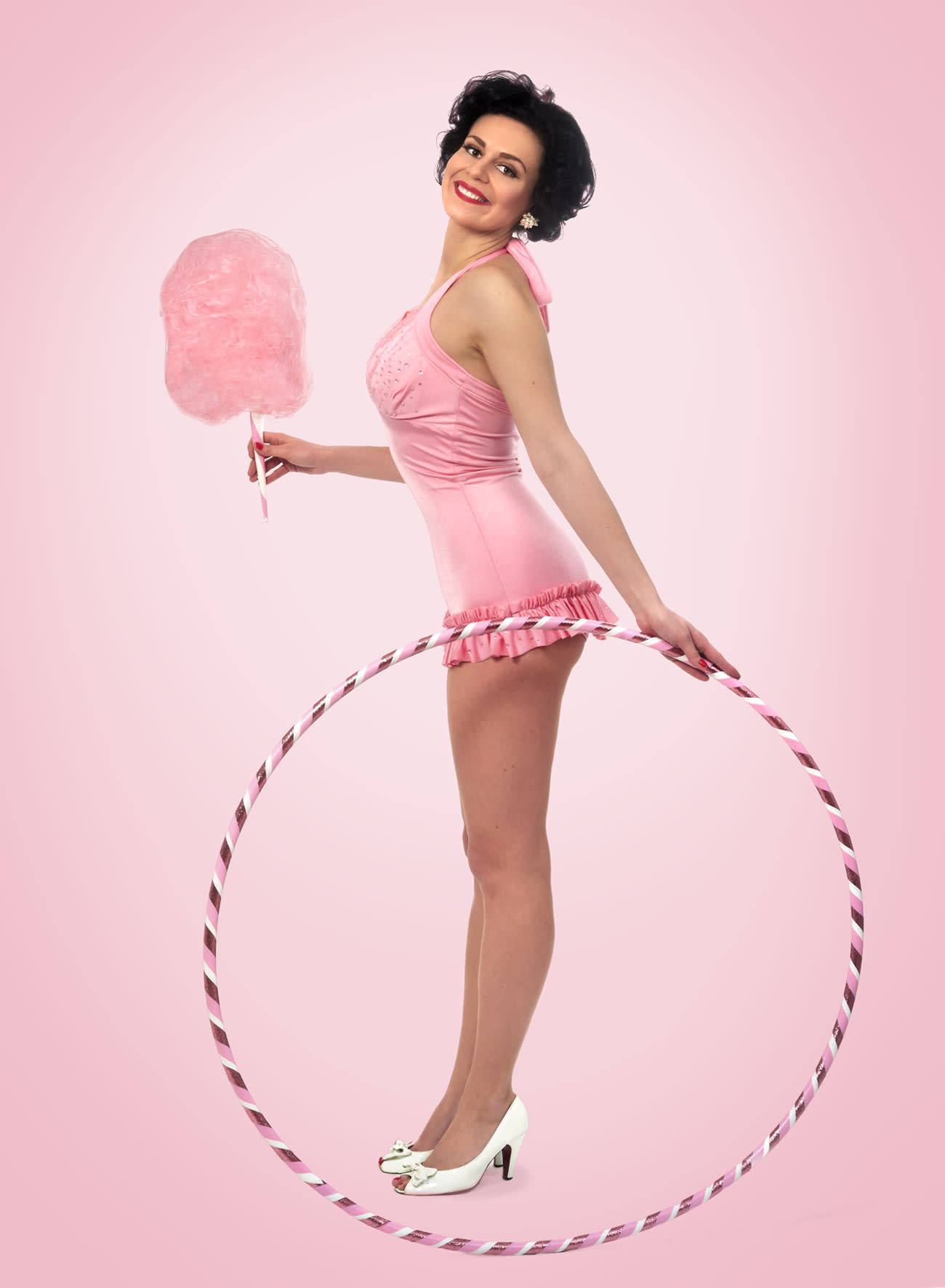 Book Miss Mia's HULA HOP SHOW til firmafesten, konferencen, fødselsdagen, kultureventet, mm.! Med glitter, humor og en gennemført 1950/60'er æstetik leverer hun et nyskabende og flot show, der kombinerer både klassiske cirkus hula hop-tricks med avancerede moderne illusions-tricks!