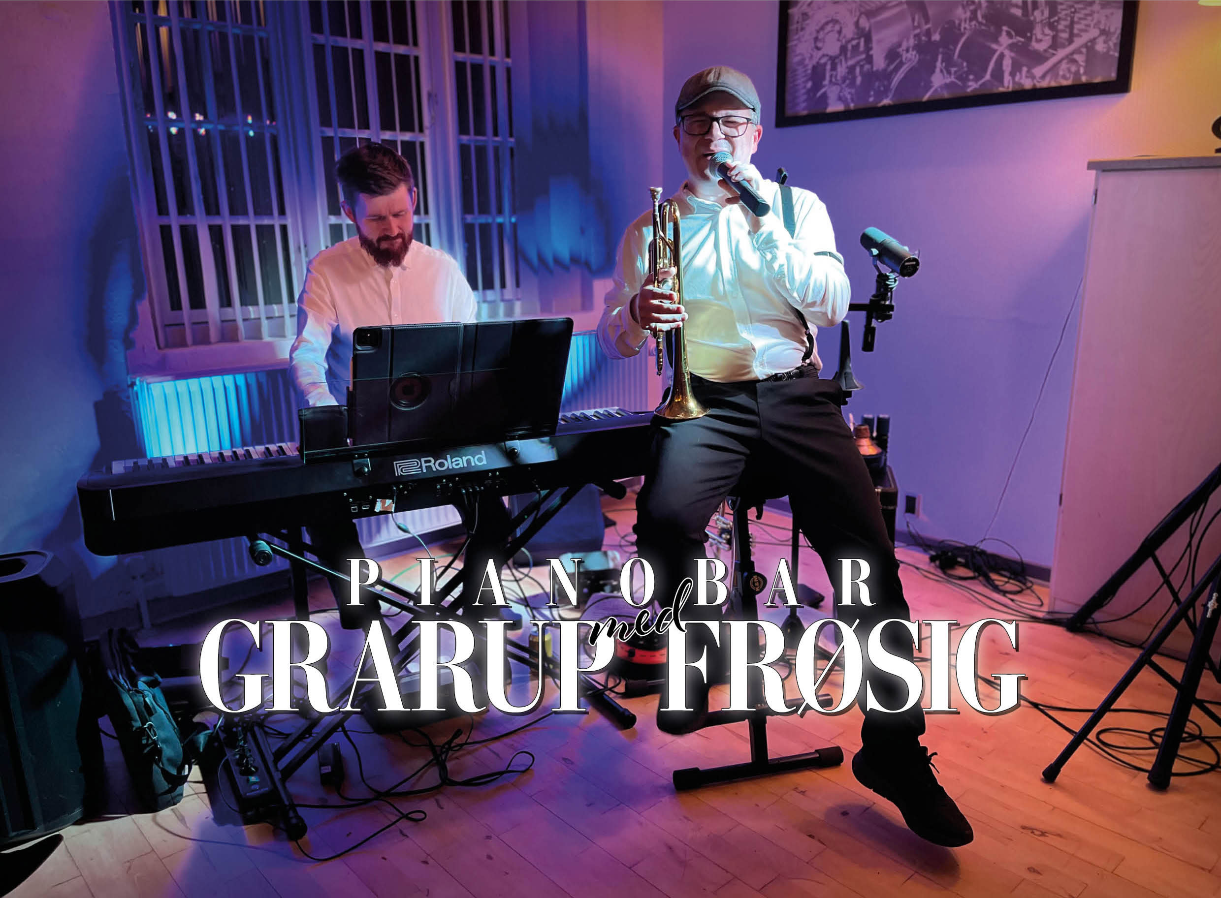 PIANOBAR med GRARUP & FRØSIG er en stemningsfuld og underholdende musikoplevelse, hvor publikum tages med på en nostalgisk rejse gennem nogle af tidens største evergreens – alle sunget på dansk. Repertoiret spænder bredt fra Elvis, Dean Martin og The Beatles til Bamse, Gustav Winckler, Paul Simon, John Mogensen og Kim Larsen.