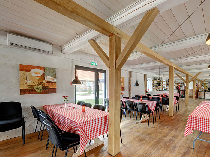 Restauranten udgør et autentisk og herskabeligt lokale. Samtidig er indretningen præget af en hyggelig og autentisk stil, der skaber en hyggelig og indbydende atmosfære. Lokalet er præget af sin lange historie, hvilket ses gennem det lyse gamle trægulv og synlige bærende bjælker, der giver lokalet charme. Yderligere er lokalet udstyret med store vinduespartier, der bidrager til den lyse og indbydende atmosfære.