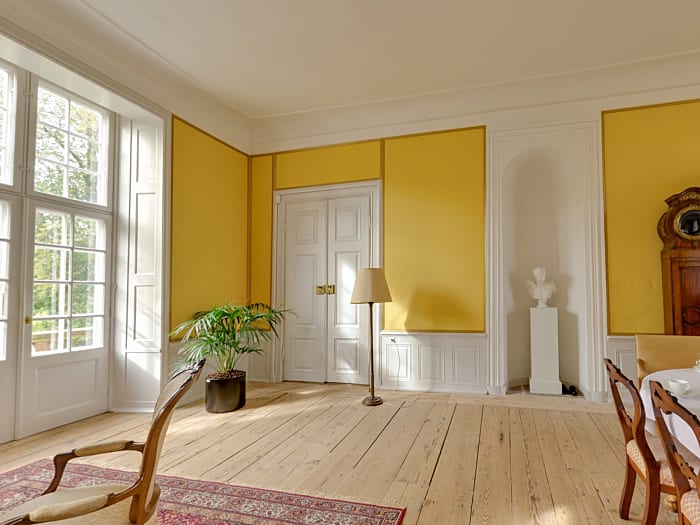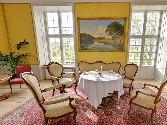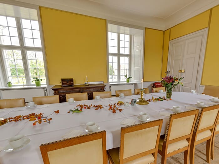Havestuen er et charmerende og herskabeligt lokale, der gennem sin herskabelige indretning med gamle snedkererede møbler, stuk og lyse trægulve udstråler eksklusivitet og finesse. Lokalet præsenterer sig ved en loftshøjde over det sædvanlige, store brede vinduespartier med sprosser samt en indbydende stil malet i sommergul farve. Tilsammen skabes der en autentisk og indbydende atmosfære, og hvor farven på væggen får smilet frem, når man træder ind i rummet. Stuen er hermed ideel til en bred vifte af arrangementer, idet lokalet tilføjer en ekstra dimension af elegance og charme.