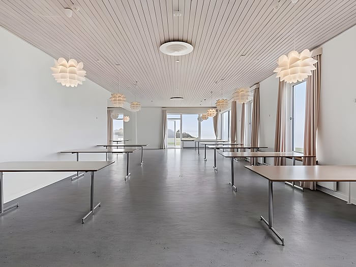 Spisesalen er et lyst og indbydende lokale med plads til 80 siddende gæster. Lokalet har store vinduespartier, som åbner rummet ud til den unikke udsigt over Båring Vig og den omkringliggende natur. Gennem disse vinduer trækkes den smukke natur med ind i lokalet, hvor ude og inde smelter sammen, hvilket skaber en særpræget atmosfære, hvor lyset strømmer ind og I vil kunne følge med i årstidernes skiften fra lokalet. Til Spisesalen hører et veludstyret industrikøkken, som gør det muligt for jer, selv at stå for forplejningen.