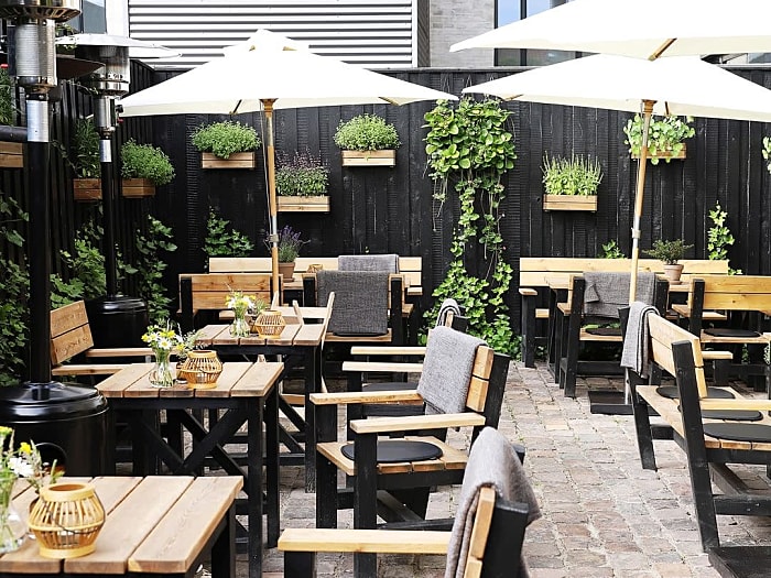 Når vejret udenfor er varmt og mildt, kan I nyde en velkomstdrink og snacks eller blot nyde en pause i godt selskab i den hyggelige gårdhave. Her er der plads til 30 siddende gæster. Gårdhaven er indrettet med hyggelige og rustikke møbler, friske urter og grønne planter, der giver en venlig og frisk atmosfære.
