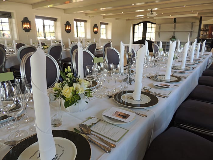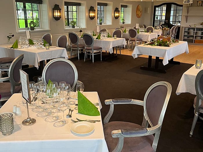 Taffelanden har en privat indgang fra gårdspladsen og byder på en betagende udsigt over Kertinge Nor, der er smuk året rundt. Lokalet er elegant indrettet i grålige nuancer, kombineret med det originale, renoverede trægulv og en varm glød i vægfarven, hvilket skaber en hyggelig og romantisk atmosfære. Toiletter og garderobe deles med restauranten, og lokalet er udstyret med en projektor, ideel til fremvisning af film, billeder og lignende præsentationer. Taffelanden har plads til op 90 gæster.