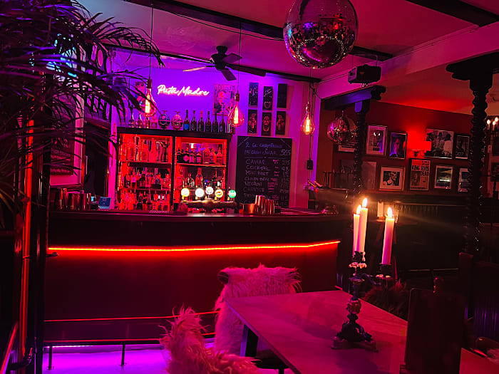 Pinds Café består af et stort lokale med plads til op til 60 gæster. Lokalet er inddelt i små mindre sektioner, hvor I kan sidde i stemningsfulde omgivelser og tage et spil terninger, tage en sludder ved baren mens I nyder en lækker cocktail eller slå jer løs på dansegulvet til højt musik under discokuglens flimrende lys. Herved er caféen et alsidigt lokale, hvor der er noget for enhver smag. Til hverdag fungerer caféen som en hyggelig bar med en god og afslappet atmosfære. Men når dag bliver til aften og nat, forvandles caféen til et atmosfærisk og festlig klub med dansegulv og god musik i højtalerne. Indretningen er holdt i en retro amerikansk stil med en dæmpet belysning, neonlys i lilla og røde farver, LED-skilte, retro plakater, siddergrupper med sorte lædersofaer og farvede stole samt rødmalede vægge, som alt sammen danner rammerne for en eksklusiv og og opløftende atmosfære, som fører jer tilbage til de glade 60'ere. Caféen danner derved de ideelle rammer, uanset om I ønsker en afslappet og hyggelig atmosfære eller en festlig aften med dansegulv og musik.