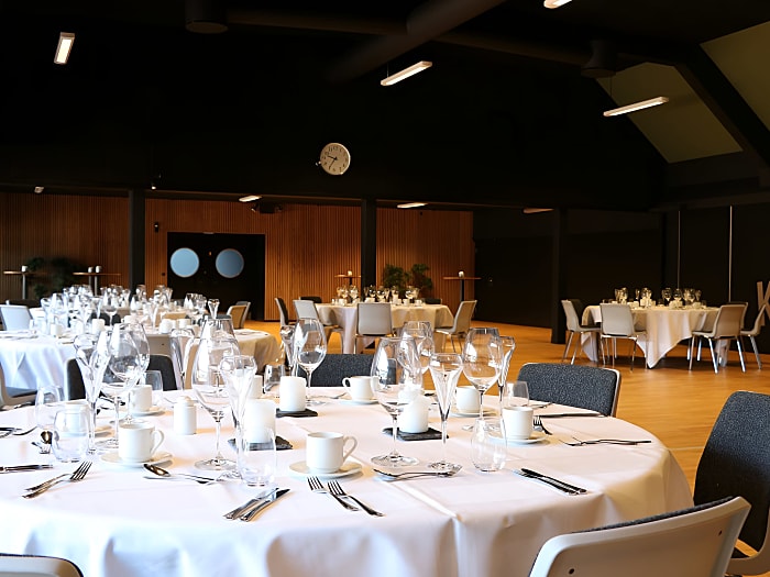 Sundsøre Salen er et nyrenoveret og moderne lokale med højt til loftet og fleksible muligheder. Lokalet fremstår lys og venligt med et godt naturligt lysindfald fra de store vinduespartier. Yderligere er indretningen holdt i en enkel og nordisk stil med træpaneler på væggene, som også fungerer som akustikpaneler, enkle møbler samt lyse trægulve. Tilsammen skabes en rolig og indbydende atmosfære, der gør lokalet ideelt til ethvert arrangement. Samtidig er lokalet utrolig fleksibelt og kan opdeles i mindre lokaler, hvis I er et mindre selskab. Fra salen er der direkte adgang til en hyggelig gårdhave.