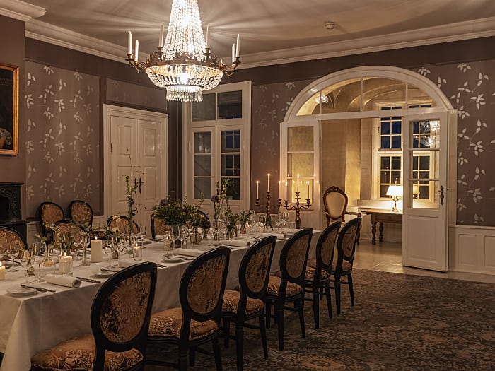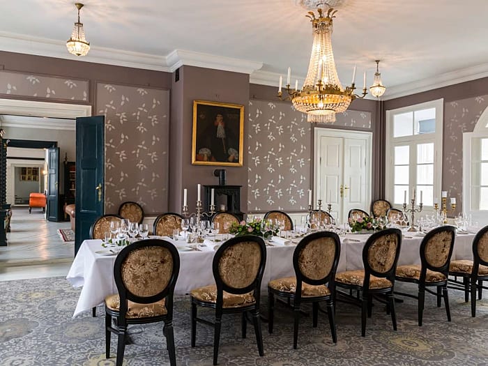 Rosensalen er fra første øjekast et imponerende syn. Salen tager jer med på en rejse til en svunden tid og tilbage til det velhavende borgerskab. Salen pryder sig med smukt dekoreret tapet, et finurligt persisk tæppe fra væg til væg, elegante lysekroner, polstrede stole i et mønstret stof, franske døre og guldindrammede malerier på væggene. Tilsammen skabes en unik atmosfære, der ikke findes magen til andre steder. I de tilhørende stuer findes bl.a. slottets hyggelige og autentiske bibliotek. Rosensalen har plads til 50 personer.