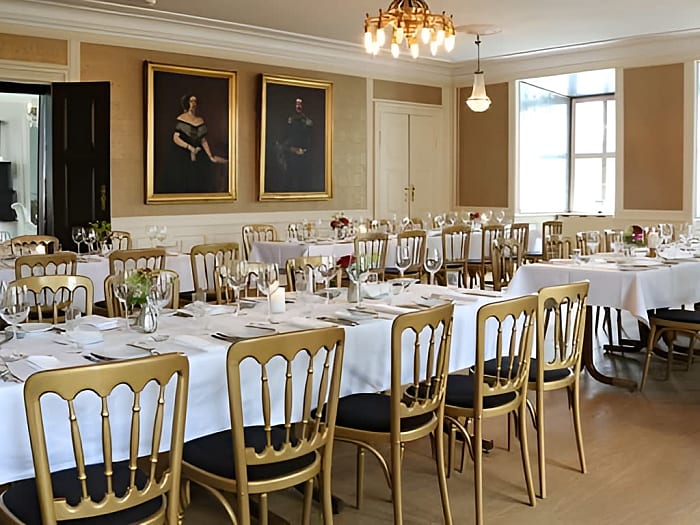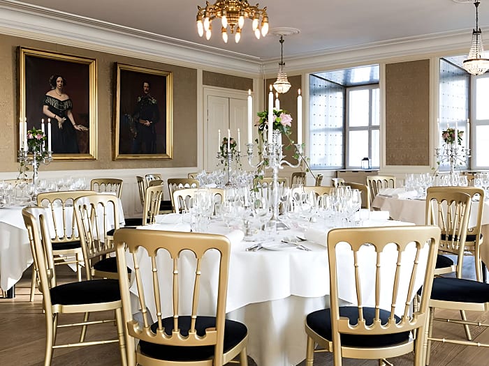 Riddersalen, slottets største lokale, er en historisk tidslomme, der byder jer indenfor til en unik atmosfære. Her er indretningen holdt i en ekstravagant og eksklusiv stil, der fører tilbage til slottets storhedstid med det fine borgerskab. Når I træder ind i lokalet, mødes I at smukke lysekroner, høje væg paneler, elegante guldstole, stuk, guldindrammede malerier samt brede planke gulve, der alt sammen taler til den atmosfæriske stemning i lokalet. Riddersalen kan rumme op til 100 gæster, og med sine rummelige størrelse, kan salen indrettes efter alle kunstens regler.