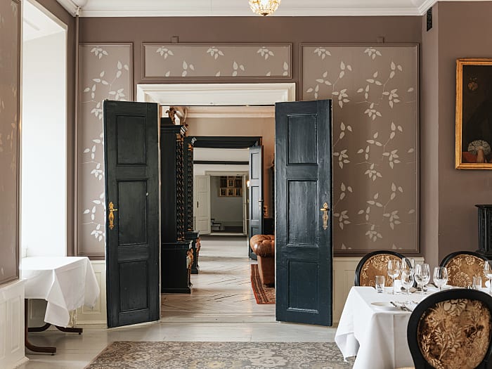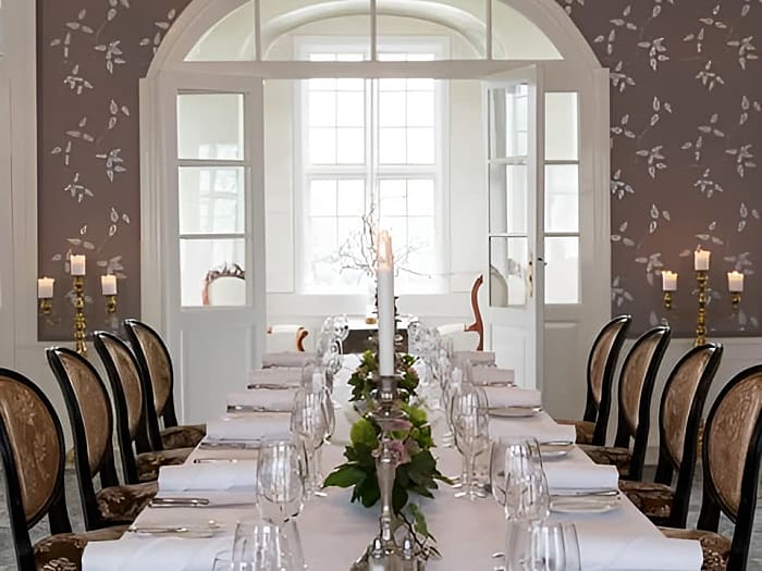 Rosensalen er fra første øjekast et imponerende syn. Salen tager jer med på en rejse til en svunden tid og tilbage til det velhavende borgerskab. Salen pryder sig med smukt dekoreret tapet, et finurligt persisk tæppe fra væg til væg, elegante lysekroner, polstrede stole i et mønstret stof, franske døre og guldindrammede malerier på væggene. Tilsammen skabes en unik atmosfære, der ikke findes magen til andre steder. I de tilhørende stuer findes bl.a. slottets hyggelige og autentiske bibliotek. Rosensalen har plads til 50 personer.