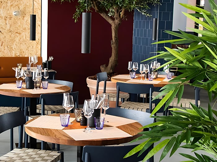 Restauranten er et hyggeligt og stemningsfuldt lokale med en moderne indretning, hvor det rustikke kombineres med det elegante. Lokalet er indrettet med rustikke spånplader, brune lædersofaer, skifferplader, enkle fletstole, dekorative pærer på væggene, luksuriøs bar samt grønne planter, som alt sammen bringer liv og stemning til lokalet. Restauranten er et stor og åbent lokale, hvilke gør det meget fleksibelt og tilpasningsvenligt.