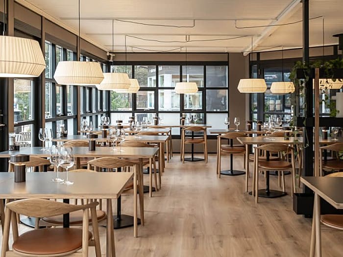 Restauranten er stilfuldt og indbydende lokale med moderne detaljer. Lokalet er præget af en nordisk stil med trægulve, træfarvede designerstole, grønne planter, elegante lamper, træpaneler omkring baren samt sorte detaljer ved vinduesrammerne og det fritstående stolper. Her skabes kontraster mellem det træfarvede interiør og de sorte detaljer, hvilket får de forskellige elementer til at træde mere frem. Samtidig giver de store vinduespartier også giver en smuk kontrast til lokalets nordiske farvepalette, hvor det naturlige lys strømmer indenfor, og trækker naturen med ind i lokalet. Tilsammen skabes en stilfuld, rolig og behagelig atmosfære, der indbyder til mindeværdige øjeblikke. Restauranten er med sin eksklusive stil og stemningsfulde atmosfære ideel til et utal af arrangementer; fra de mere intime til de mellemstore arrangementer.