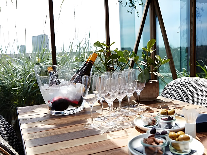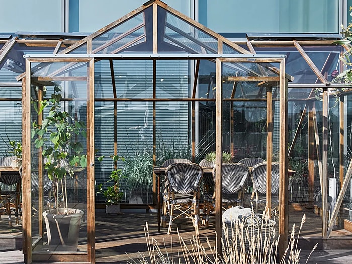 Drivhuset, med en størrelse på 28 m² og en loftshøjde på 2,5 meter, er ideelt til boardroom-møder med plads til op til 20 personer. Terrassen er perfekt til stående receptioner, hvor op til 50 gæster kan nyde den friske luft og den smukke udsigt over havnen.
