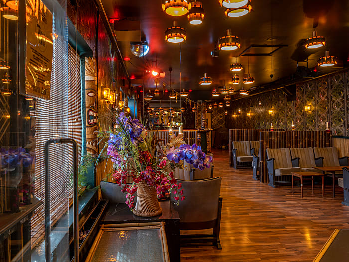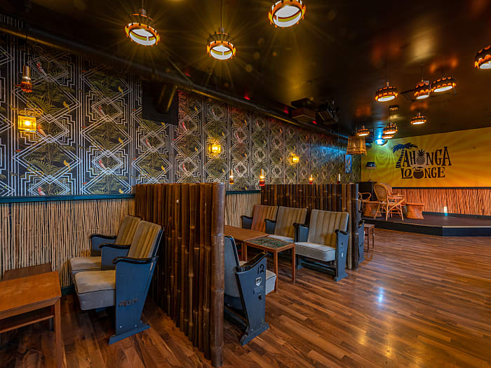 Tiki-inspireret festlokale i Hillerød med bar, scene, musikanlæg og gårdhave.