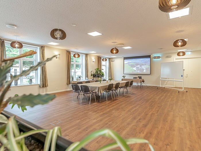 Flipover, Lydanlæg, Lærred, Mikrofon, Projektor, Scene, Smartboard, Whiteboard, Wifi