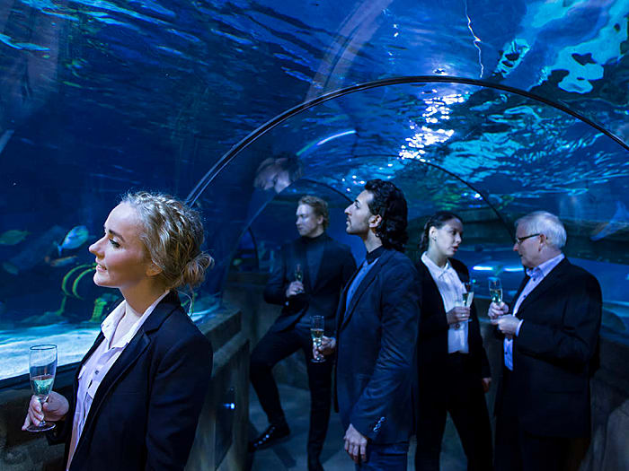 Start med en velkomstdrink i undervandsuniverset Atlantis og oplev verden under havets overflade blandt hajer, rokker, søheste og tropiske fisk.