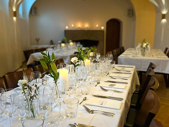 Festsalen kan have selskaber med helt op til 120 gæster. Det flotte sildeparket gulv, det hvælvede loft og den levende pejs i salen danner nogle helt unikke rammer for enhver fest.