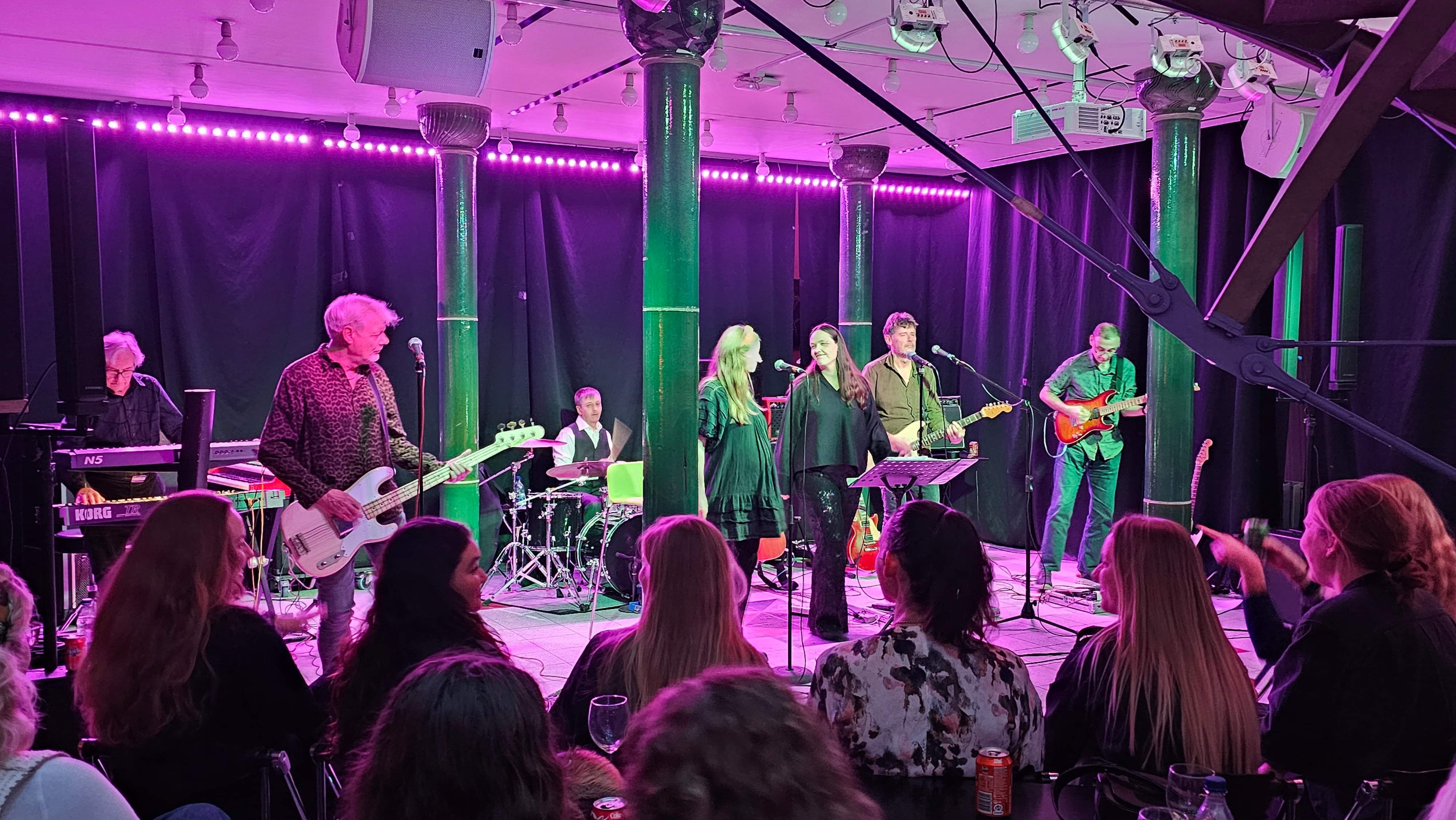 To sangerinder i front foran fem sammenspillede, velspillende, rutinerede musikere.