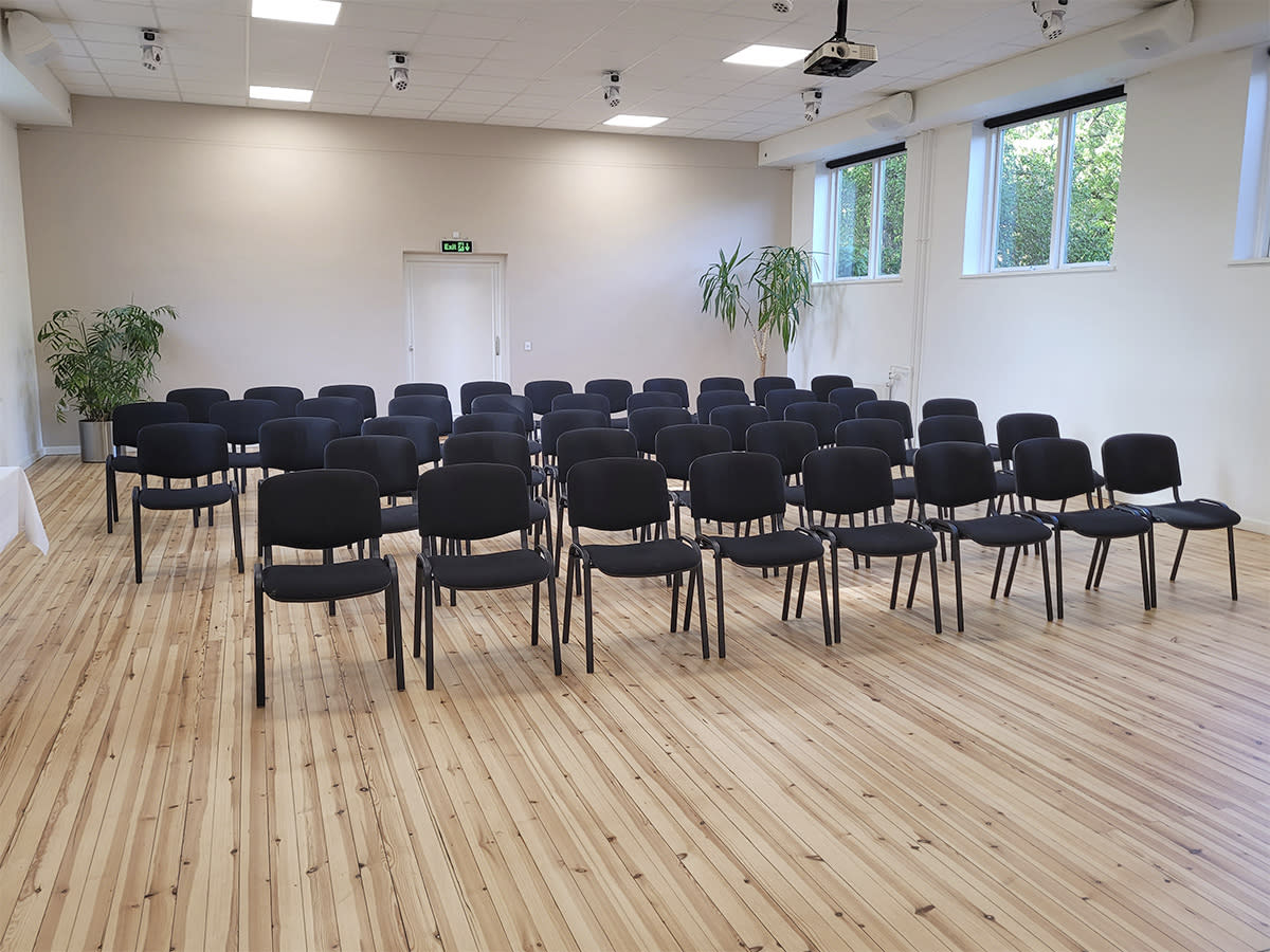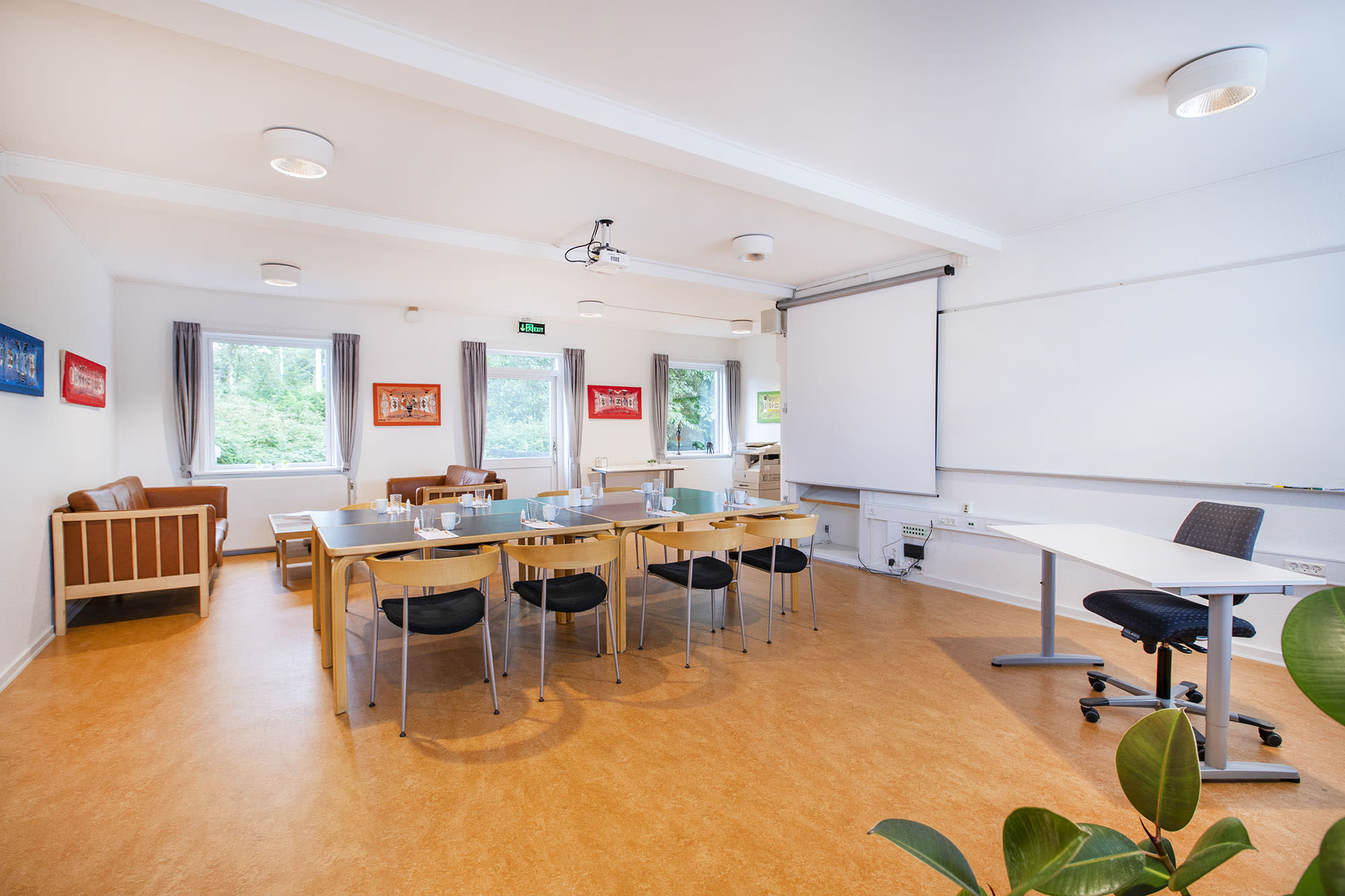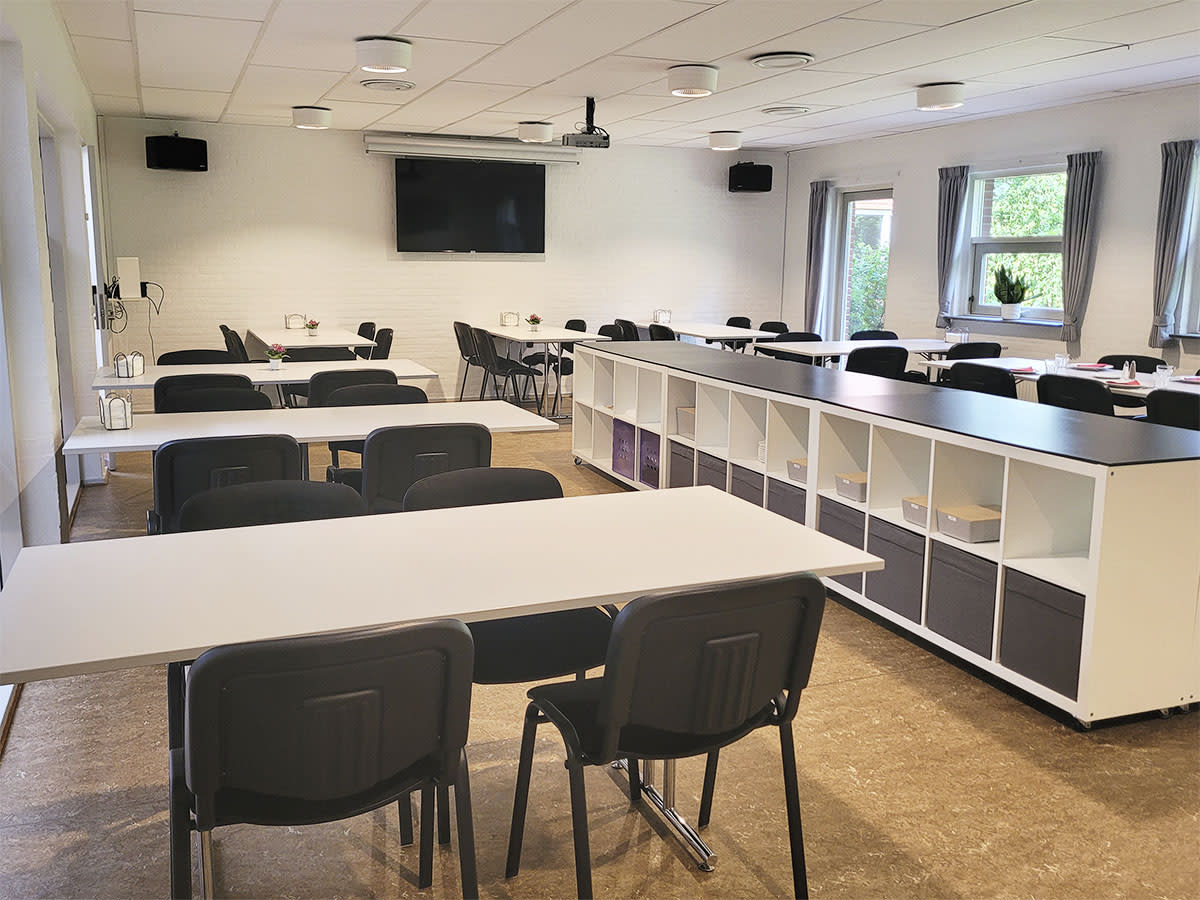 Kursus 2 kan rumme op til 27 deltagere, og er et fleksibelt lokale med moderne AV-udstyr. Her er der også en unik udsigt over haven, som også skaber et godt lysindfald, der giver en rummelig og rolig stemning.