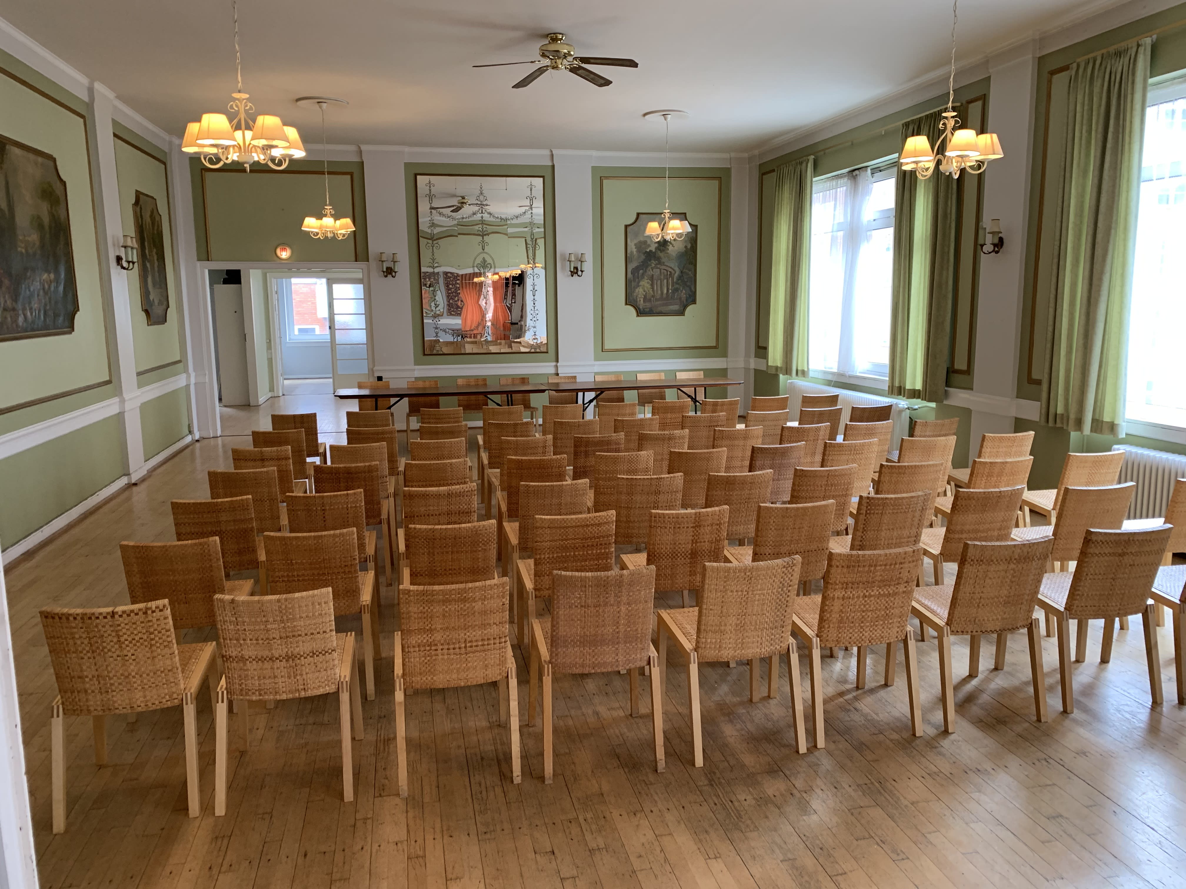 Grøn stue, beliggende i stueplan med adgang til gården, egner sig til 30-50 personer. Indretningen er hyggelig og stilfuld med grønne nuancer på væggene. Lokalet kan også anvendes som gruppelokale eller udvidelse af den store sal.