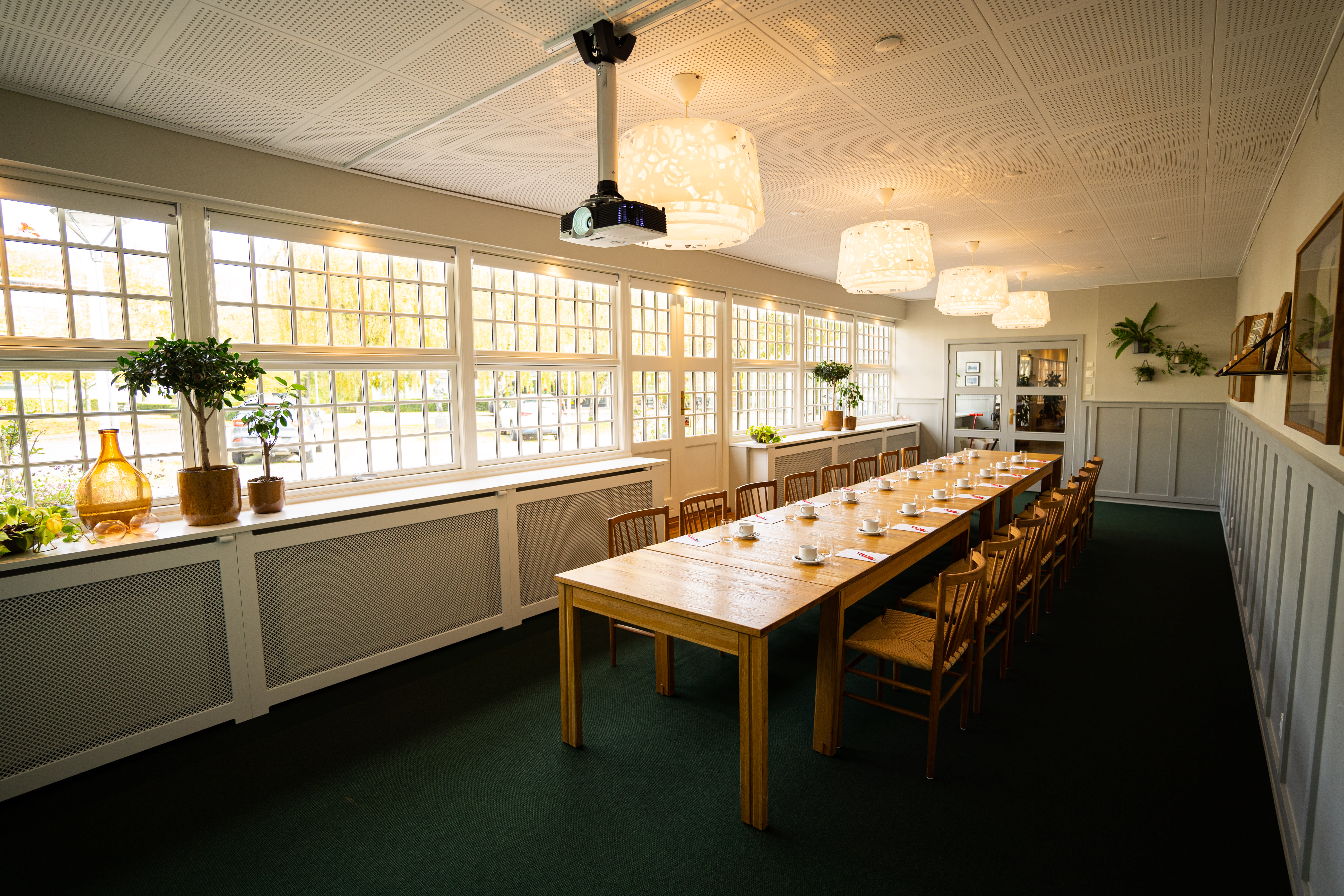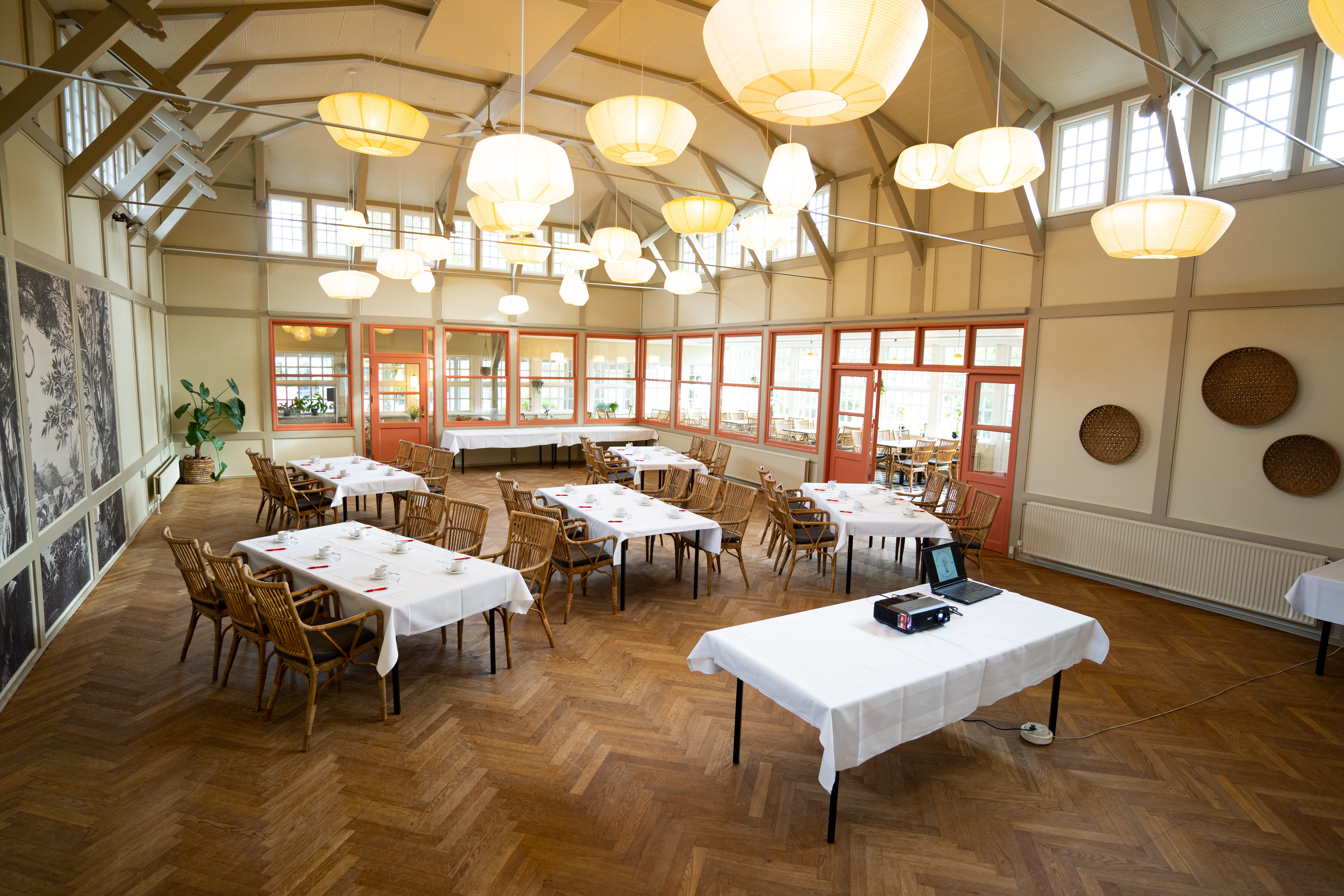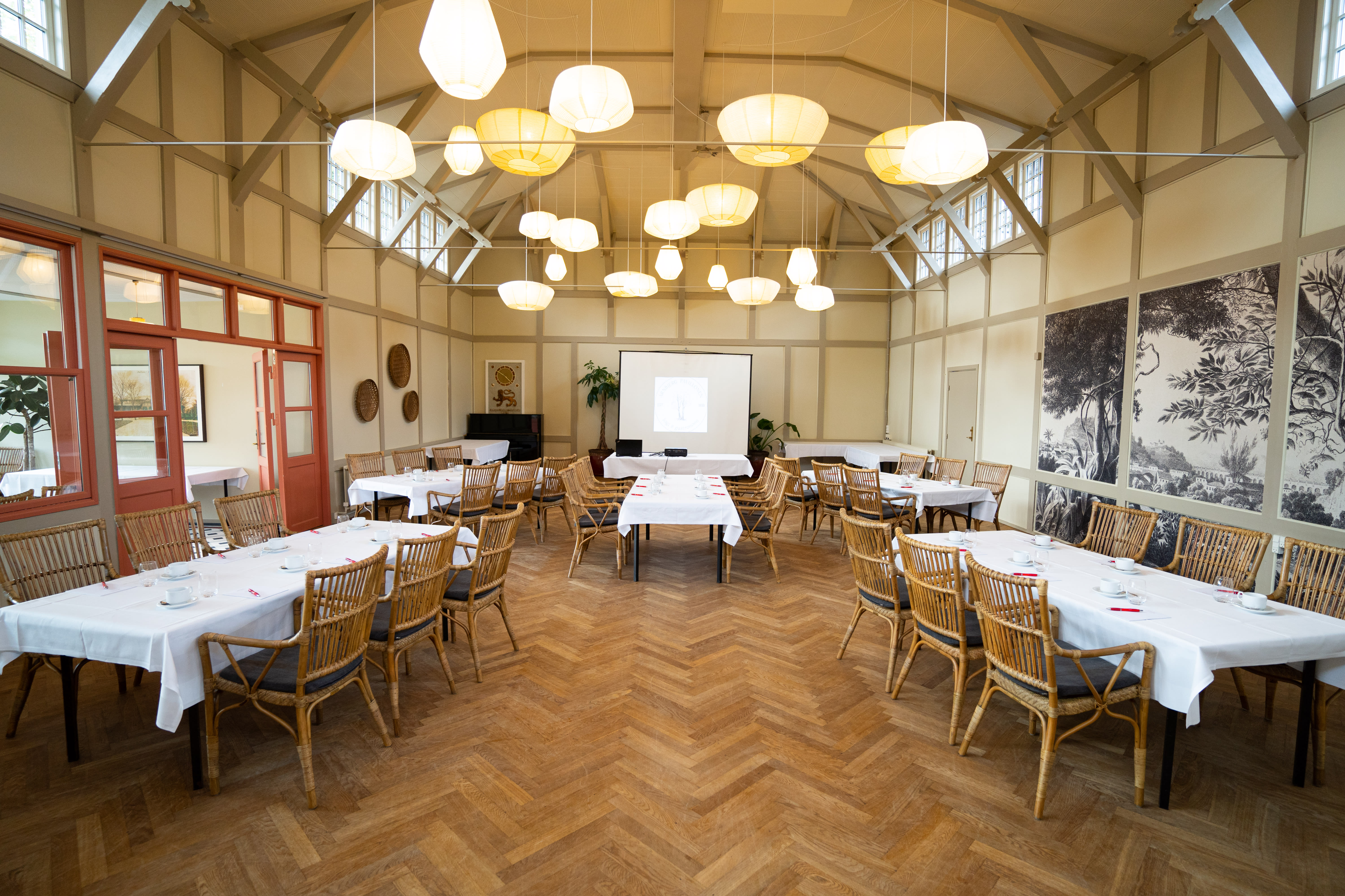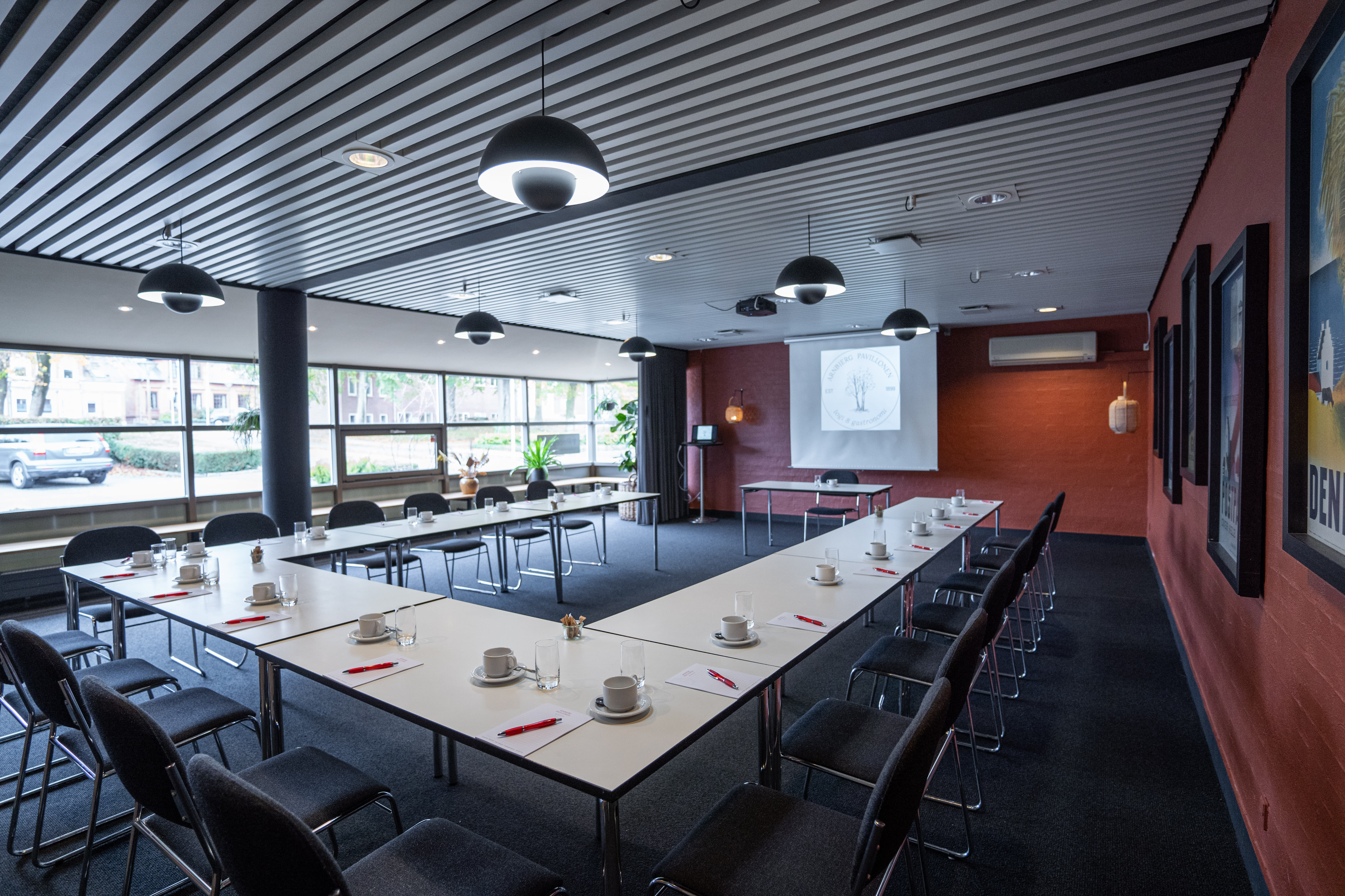 Arnbjerg Pavillonen byder på fleksible og veludstyrede lokaler, der kan tilpasses enhver form for erhvervsarrangement. Med plads til både små og store grupper kan I vælge mellem alt fra intime møderum til større sale, der nemt kan rumme op til flere hundrede deltagere. Store vinduespartier lukker dagslyset ind og skaber en indbydende atmosfære, mens det avancerede AV-udstyr sikrer, at jeres præsentationer afvikles problemfrit. De grønne omgivelser i Arnbjergparken skaber desuden en naturlig kulisse, der indbyder til inspirerende pauser eller udendørs teambuilding-aktiviteter.