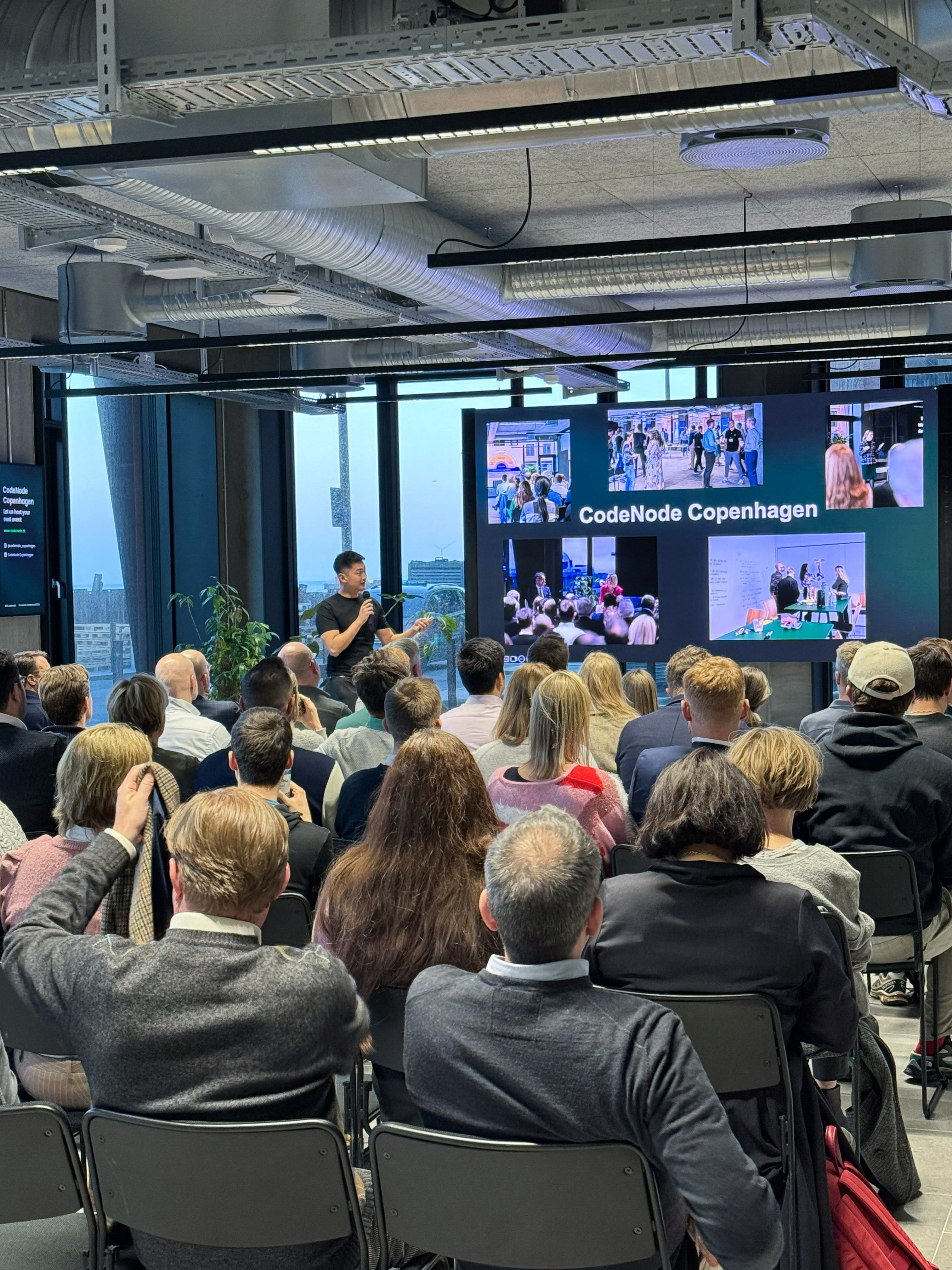 CodeNode er et multifunktionelt teknologi venue specialudviklet til digitale, kreative og innovative arrangementer i industrikvarteret ved Nordhavn. I en nyopført moderne bygning tilbyder CodeNode et 500 kvm stort højteknologisk eventspace udstyret med det nyeste AV-udstyr. Lokationen består af et stort konferencelokale samt flere funktionelle mødelokaler, der er udstyret med vægge, som gør det muligt at skrive direkte derpå. Med sine mange fleksible løsninger i form af lokaler og med et team bestående af erfarne medarbejdere er CodeNode den ideelle lokation, uanset om I planlægger et intimt møde på 4 personer eller store events og konferencer med 150 deltagere. Beliggende i Nordhavn er det bekvemt for alle deltagere uanset transport at ankomme destinationen. Nordhavn er en bydel i rivende udvikling, hvor de gamle industribygninger har fået nyt liv. Bydelen udgør idag et levende og attraktivt område med korte afstande til alt, hvad hjertet begærer, og hvor havnens industrihistorie holdes ved lige og udgør en vigtig faktor i den hyggelige og livlige stemning i området. Med denne beliggenhed er I sikret gode transportmuligheder i området, ideelle omgivelser, som oser af kreativitet, iværksætteri og nytænkning samt en unik havudsigt.