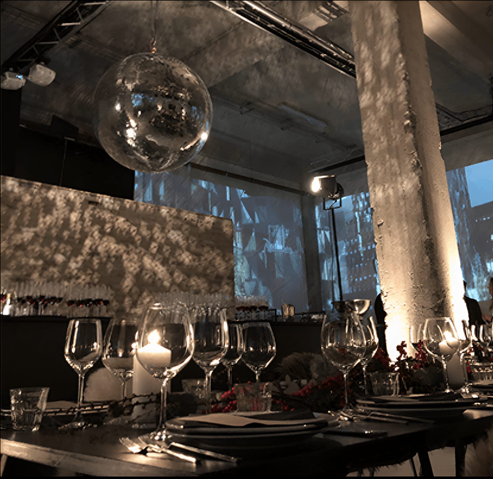 GARAGEN, et 400 kvm stort eventlokale, er beliggende midt på mellemarmen i smørhullet mellem Aarhus' pulserende byliv og industrihavnen. Lokalet er en gammel værkstedsbygning, hvilket også afspejles i indretningen, der er holdt i en rustik og industriel stil med game paller som afskærmere og betongulve. Samtidig er der tilføjet et elegant moderne touch med spejle på palle-væggene og velourstole. GARAGEN bærer på en rummelighed ud over det sædvanlige, hvilket gør alle ideer og ønsker mulige. Yderligere findes udsigten over Aarhus ikke bedre, end fra dette lokale.