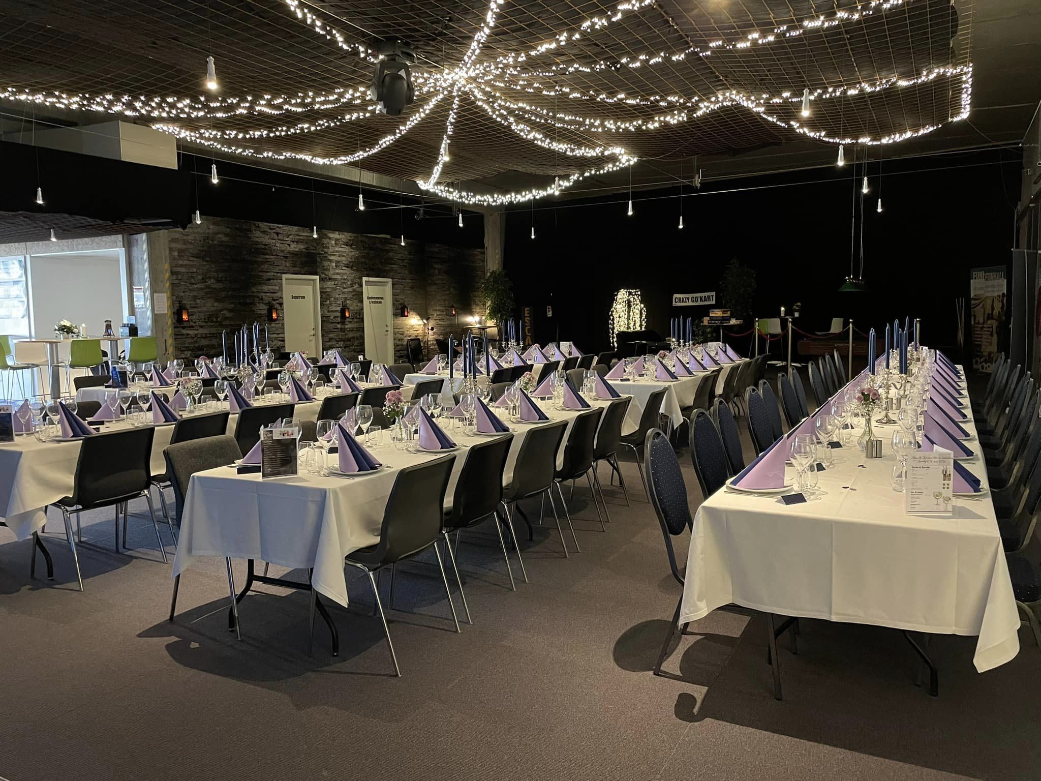 Funhalls 4000 m2 indendørs faciliteter byder på et væld af muligheder. Ud over de mange aktivitetshaller, indendørs fodboldbane og go-kartbane, råder stedet over et fleksibelt spiseområde med en stor bar. Dette område kan tilpasses arrangementets karakter, hvad enten der ønskes elegante bordopstillinger med pynt, afslappede buffetborde eller et festligt dansegulv med diskolys. For mere formelle sammenkomster tilbyder Funhall to moderne og indbydende lokaler: et med plads til 55 gæster og et større, der kan rumme op til 120 personer. Begge lokaler er indrettet i en neutral, moderne stil, hvilket gør det muligt for jer at sætte jeres personlige præg på omgivelserne. Lokalerne er udstyret med moderne AV-udstyr og andre nødvendige faciliteter for at sikre de bedste mulige rammer for en vellykket dag.