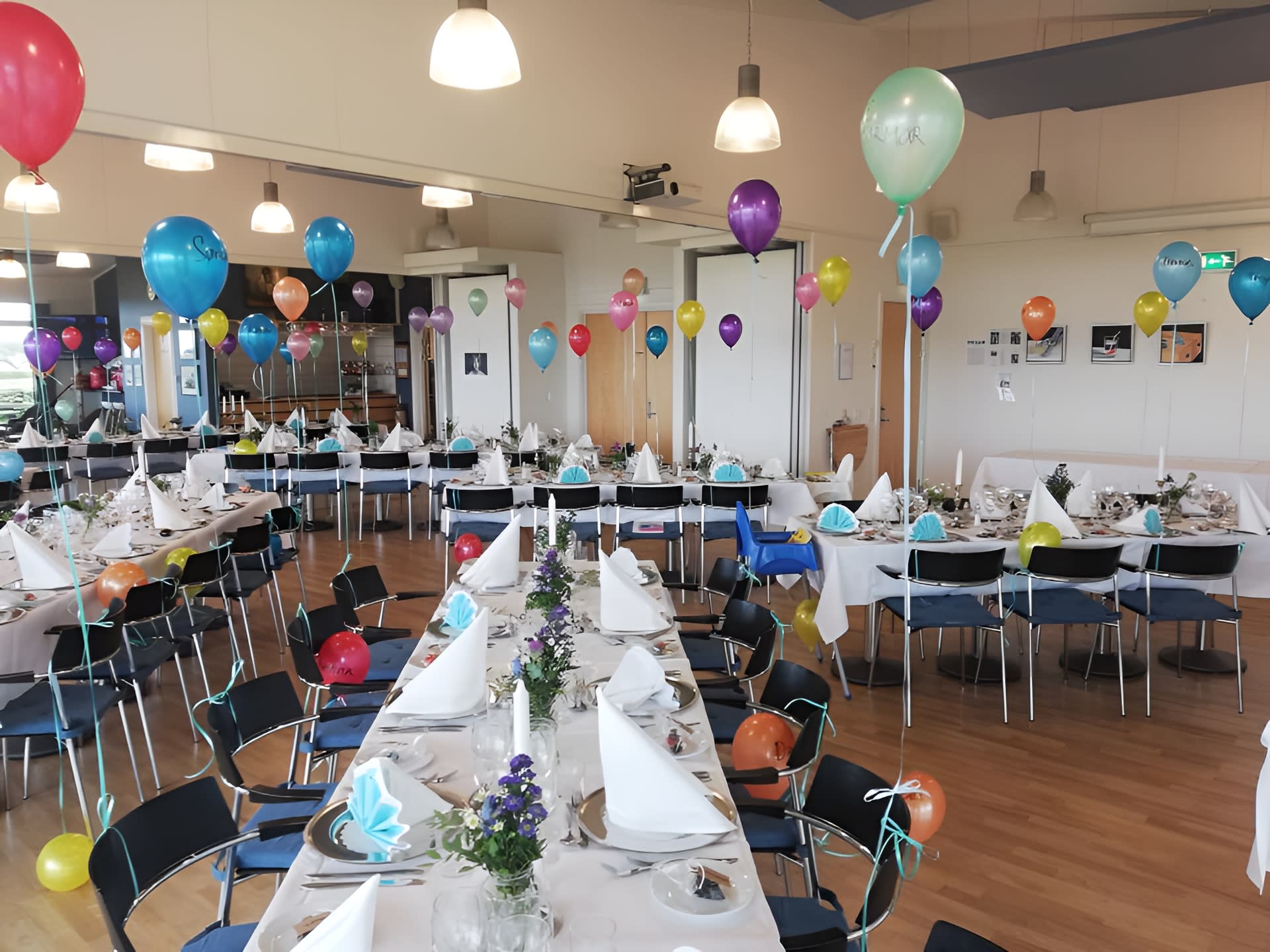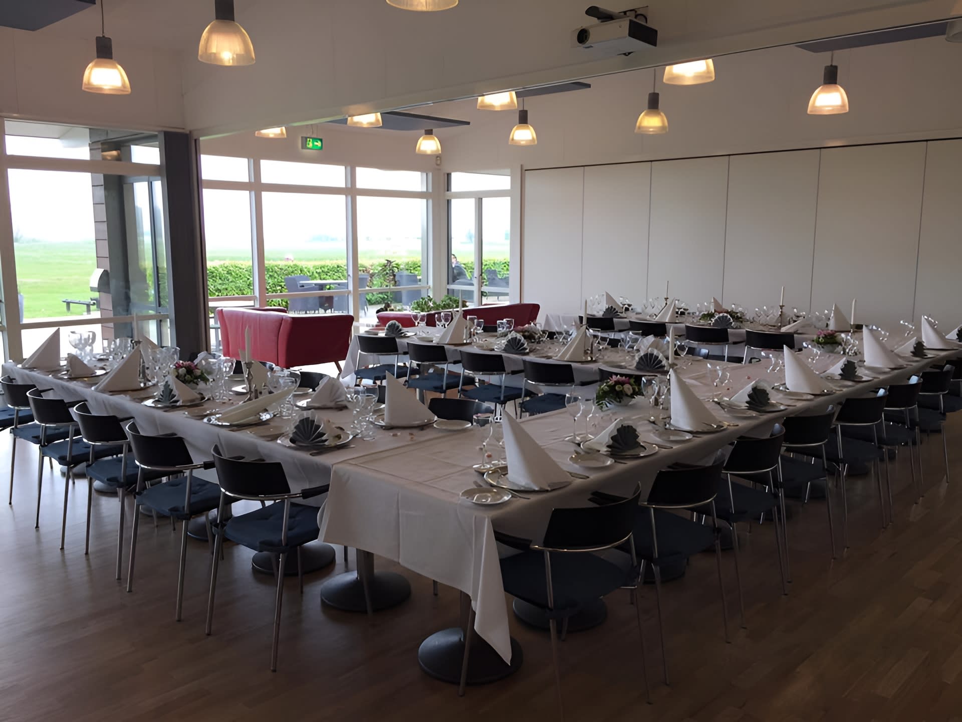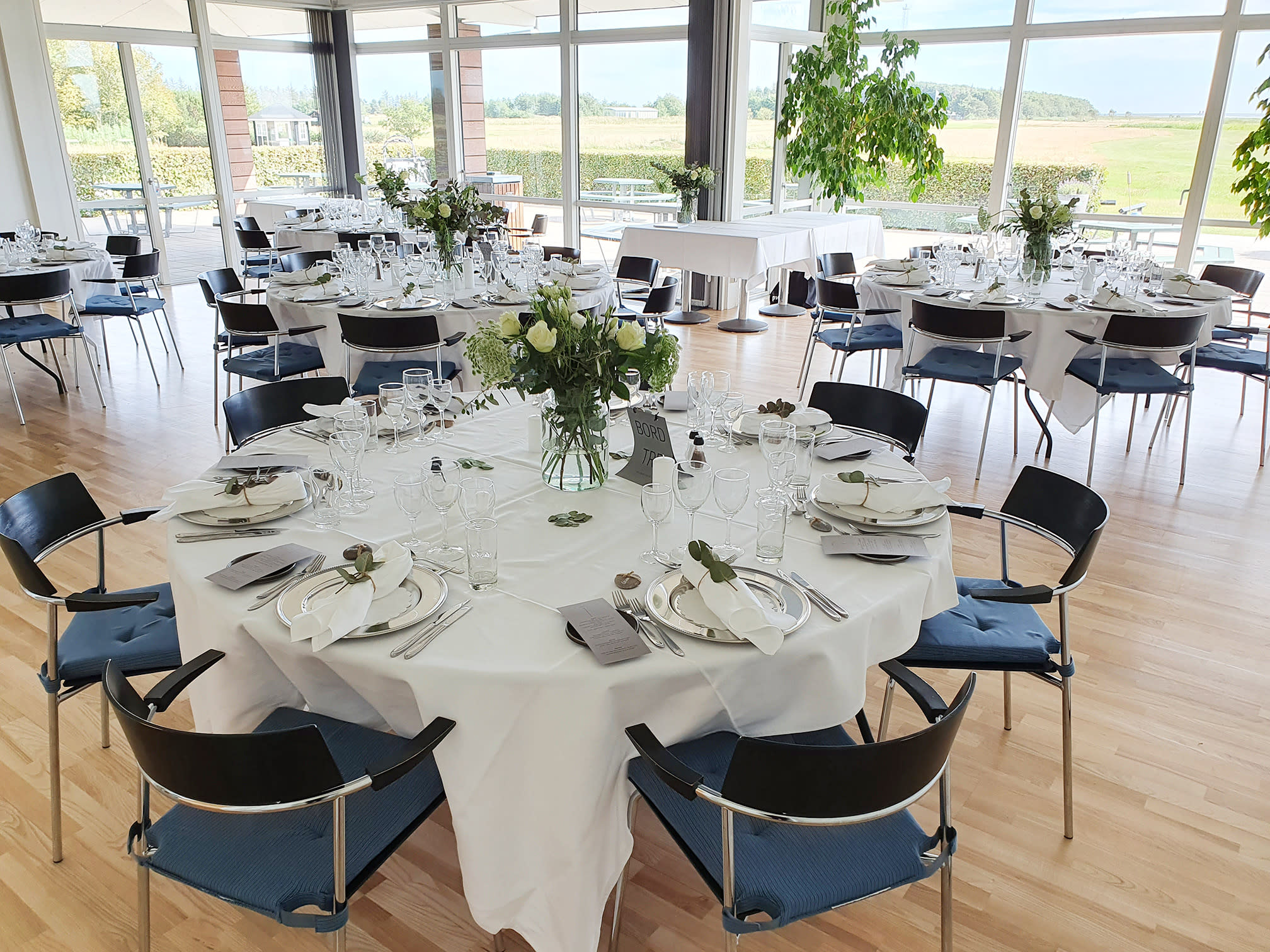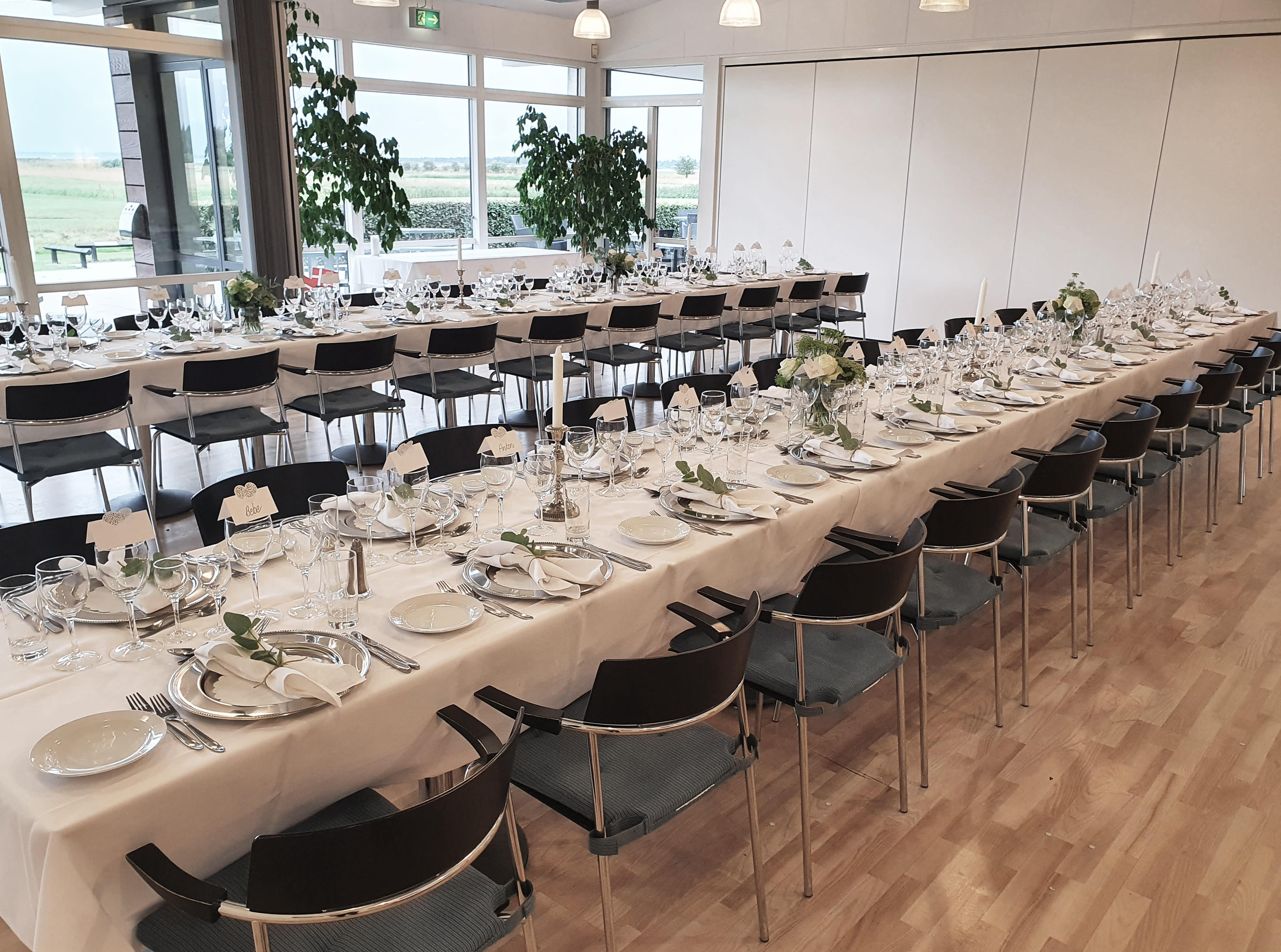 Selskabslokalet er lyst og indbydende, og kan rumme op til 65 gæster. Med sine store vinduespartier, strømmer det naturlige lys ind fra alle sider, hvilket medvirker til at skabe en rummelig og hyggelig atmosfære, hvor naturen kommer med ind i lokalet. Indretningen er holdt i en neutral stil med en moderne og indbydende møblering og lyse vægge og lofter. Lokalet kan tilpasses efter antallet af gæster samt jeres ønsker til udformning, idet lokalet er udstyret med foldevægge. Dermed er det muligt at afholde mellemstore arrangementer samt mindre og intime arrangementer gennem opsætning af disse foldevægge. Mulighederne er derfor mange, hvor lokalet kan udnyttes og designes efter jeres ønsker og behov.