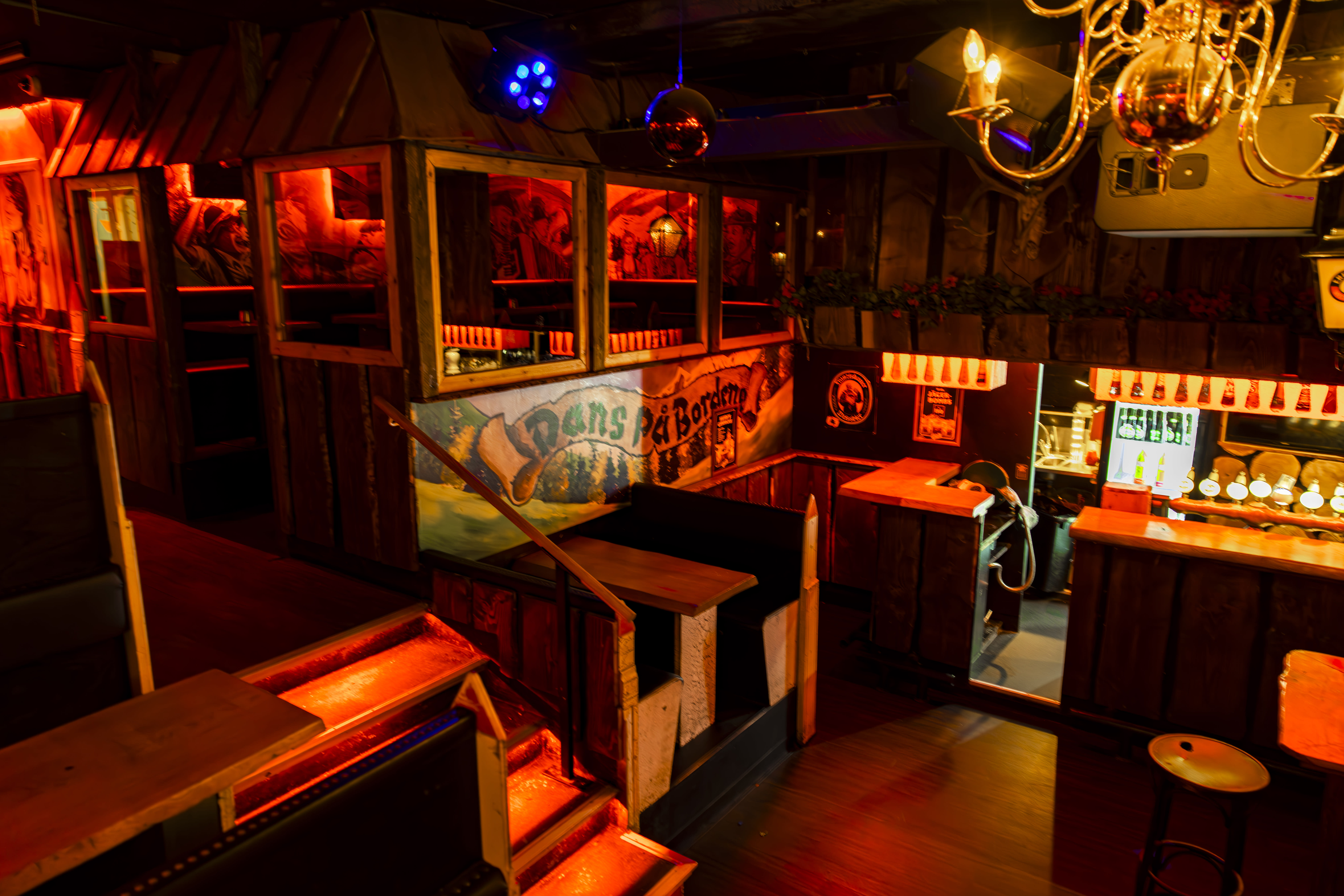 Baren tilbyder flere etager og lokaler, der kan lejes til private arrangementer, hvilket gør det ideelt til fester som polterabender og fødselsdage. Den intime og hyggelige indretning, med træbeklædte overflader og festlige detaljer, understøtter det alpine tema og giver gæsterne mulighed for at danse på borde og bænke.
