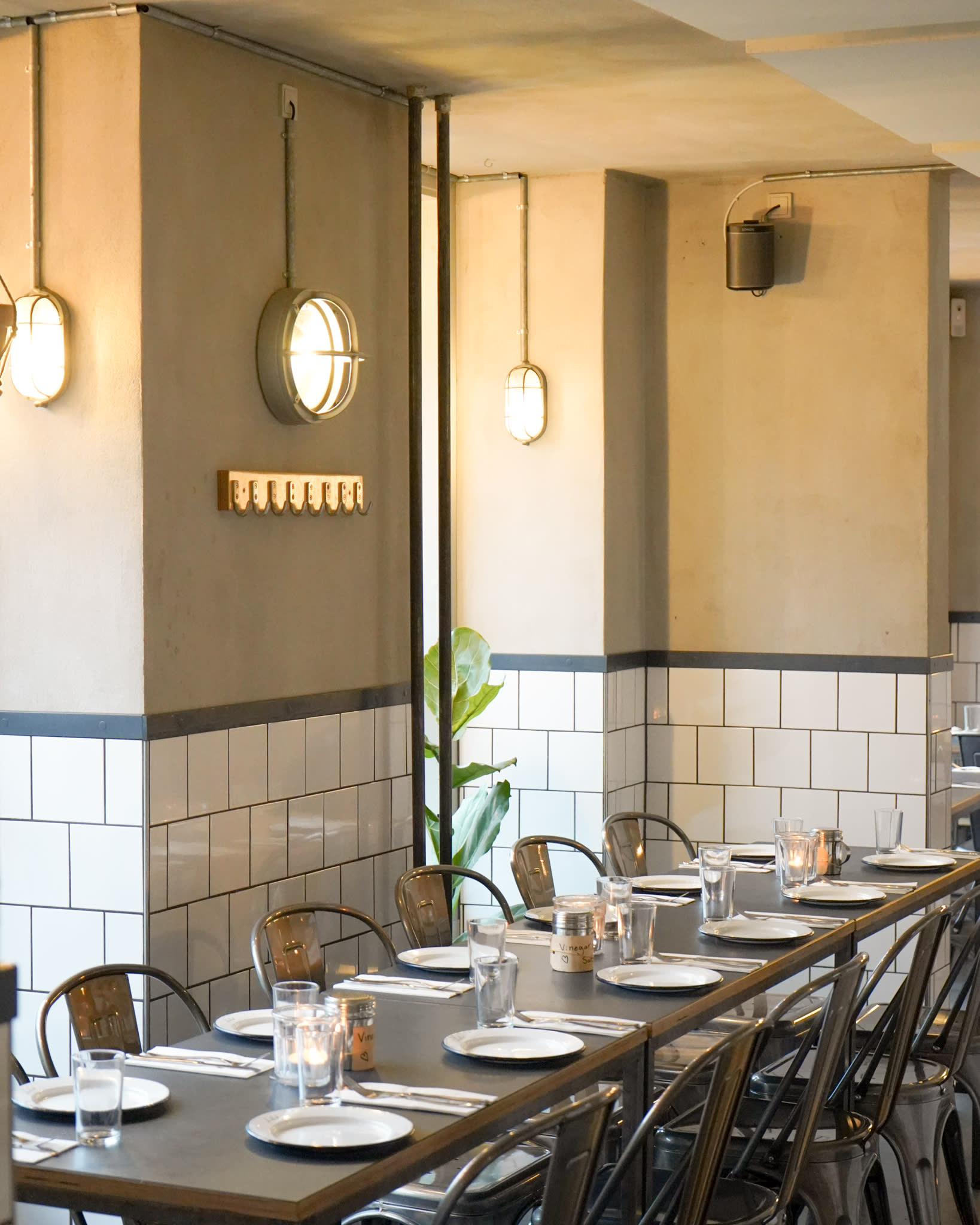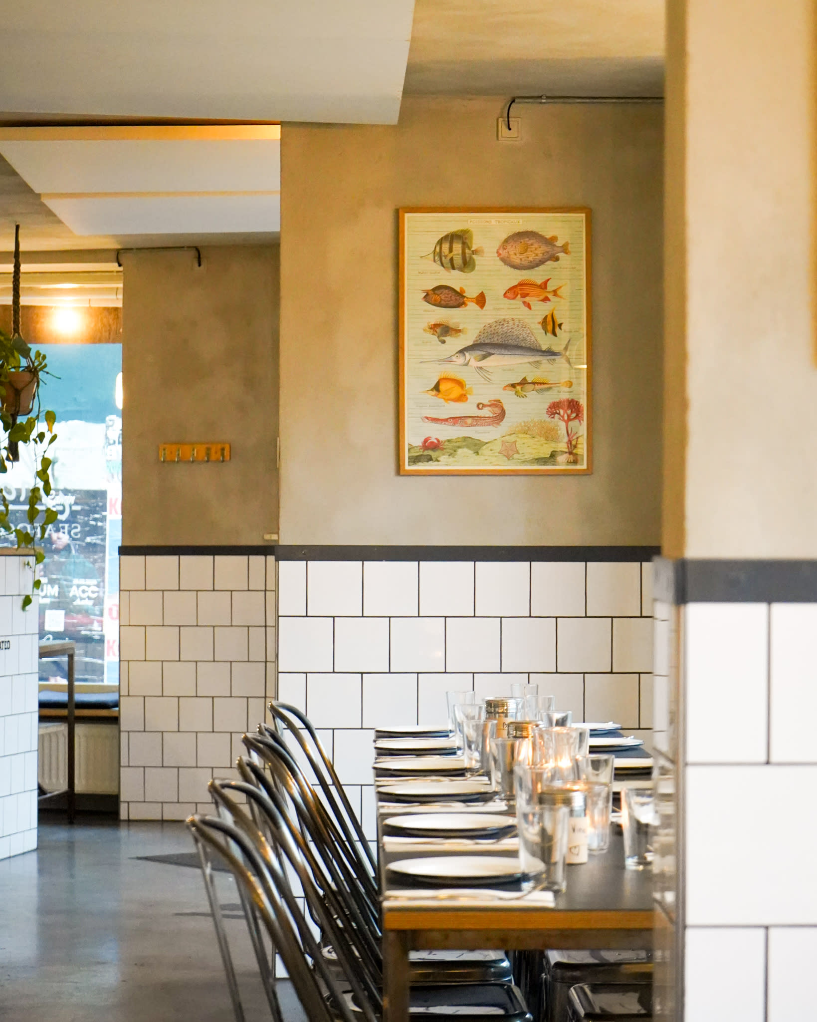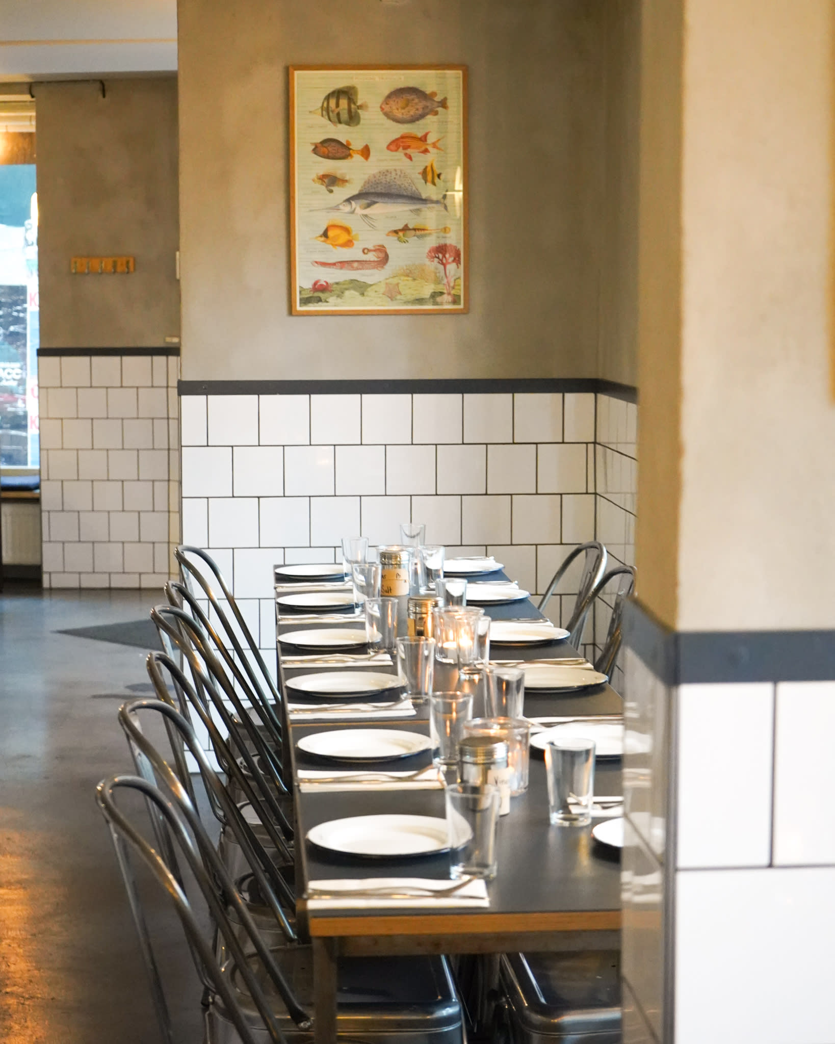 Restauranten byder på en lys og indbydende atmosfære takket være de store vinduer, der strækker sig langs hele facaden. For dem, der søger en mere privat oplevelse, tilbyder vi et eksklusivt baglokale med egen indgang, perfekt til mindre selskaber på 8-20 personer.