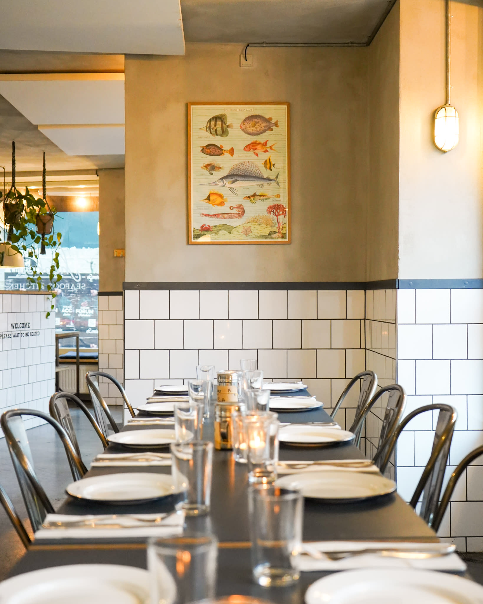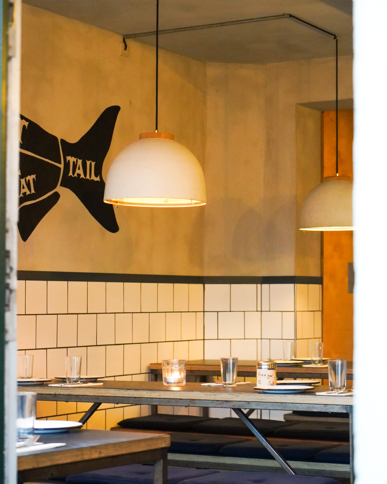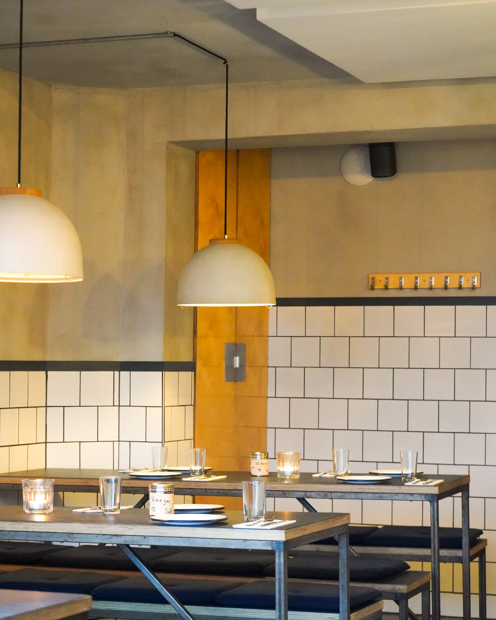 Restauranten byder på en lys og indbydende atmosfære takket være de store vinduer, der strækker sig langs hele facaden. For dem, der søger en mere privat oplevelse, tilbyder vi et eksklusivt baglokale med egen indgang, perfekt til mindre selskaber på 8-20 personer.