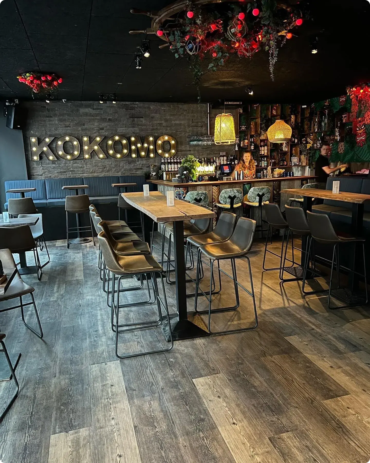 Lokationen rummer 3 etager, hvor hvert lokale på danner sin gene atmosfære og bidrager til en unik stemning på alle etagerne. I stueetagen findes Tiki-baren, som er lokationens eksotiske Hawaii-inspirerede bar, der fungerer som startskudet på en ideel aften. Her serveres lækre cocktails og drinks samt andre lækre drikkevarer, med det ekstra twist at mange af disse serveres med flammer og i karakteristiske tiki-mugs. Stemningen i tropiske oase er derved lagt. På etagen ovenfor findes Natklubben, hvor lokationens DJ spiller op til dans på det farverige dansegulv. Natklubben er et unikt lokale med et LED-lysshow, formet som hexagoner, der strækker sig over hele loftet. Lokalet er det perfekte lokale for en mindeværdig fest med fantastisk musik og et imponerende lysshow. På Kokomos øverste etage findes den opvarmede rooftop-bar. Rooftoppen kan dermed benyttes hele året rundt og er garant for en fantastisk stemning, hvor bar-personalet serverer lækre drinks go cocktails natten lang.