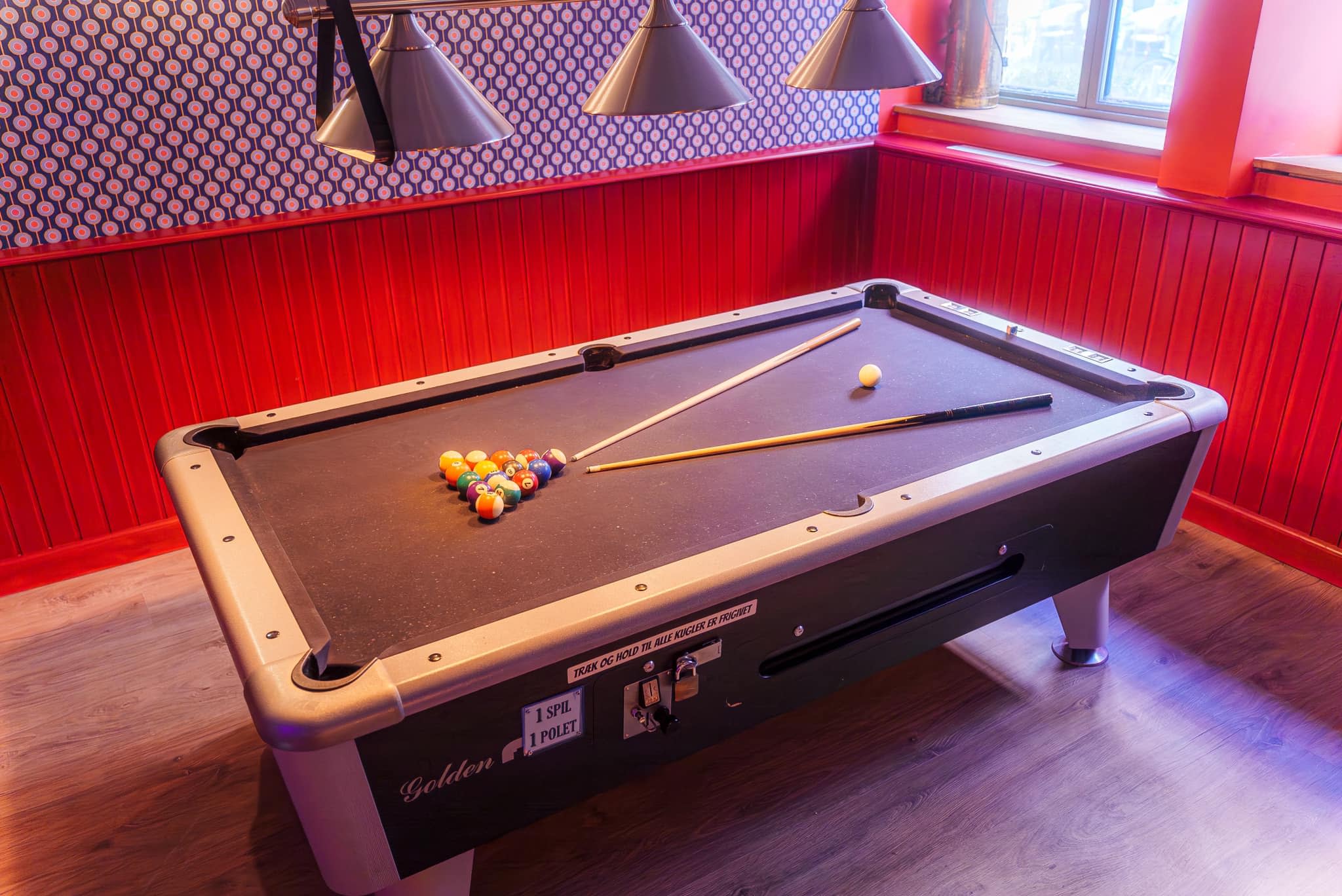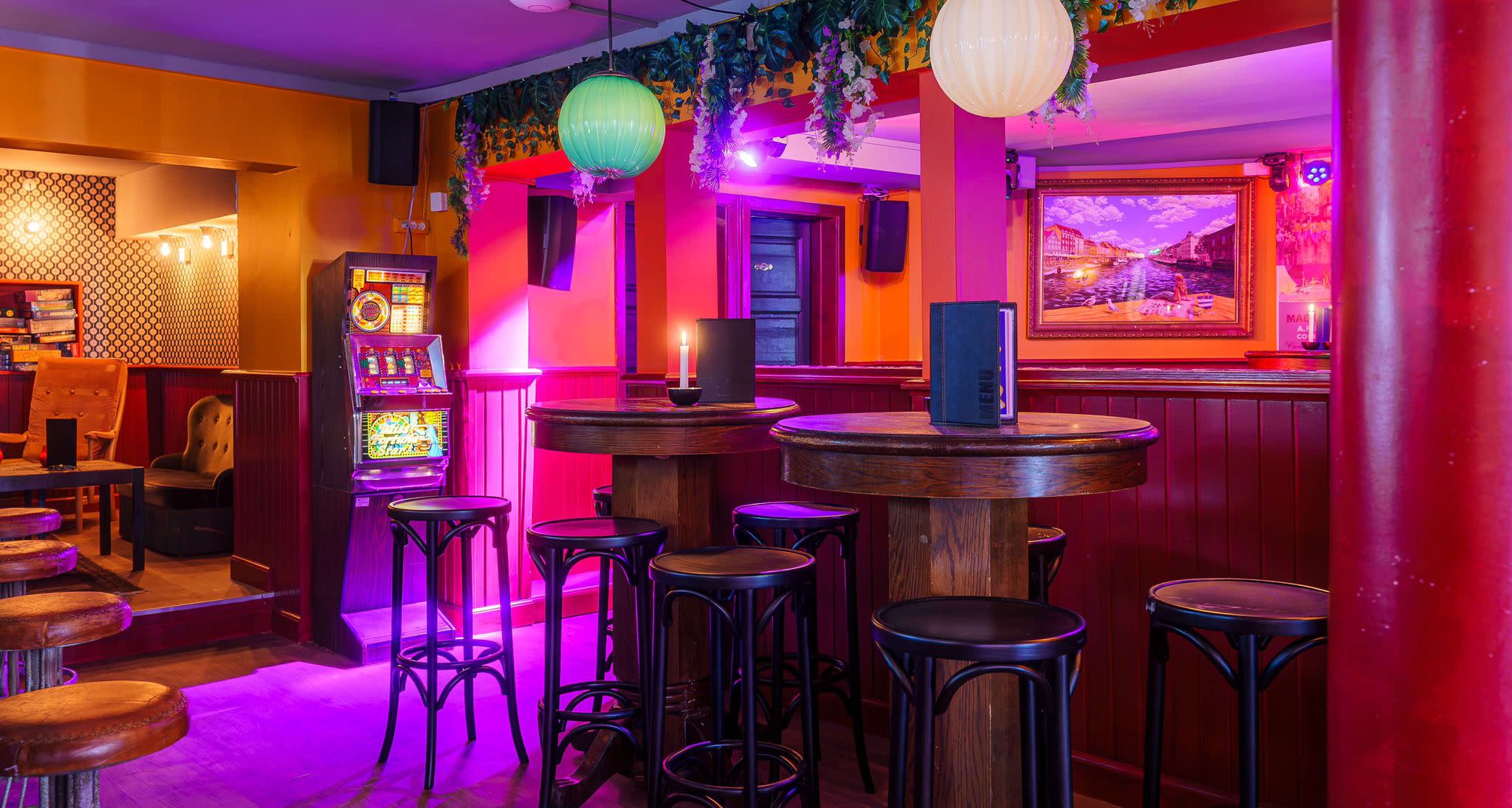 Palmehavens indretning er en kærlig hyldest til dansk design og hygge. Her finder I blomstrede sofaer, autentiske stole og klassiske tæpper side om side med moderne elementer som neonlys og spillemaskiner. Hvert hjørne af baren byder på en ny oplevelse - fra det livlige dansegulv til de hyggelige sofakroge. I kan udfordre hinanden i pool, dyste i Playstation-spil eller bare nyde en drink i barens imødekommende atmosfære. Med plads til både intime samtaler og store fester, tilpasser Palmehaven sig enhver anledning, hvad enten det er en afslappet aften med venner eller en stor firmafest.