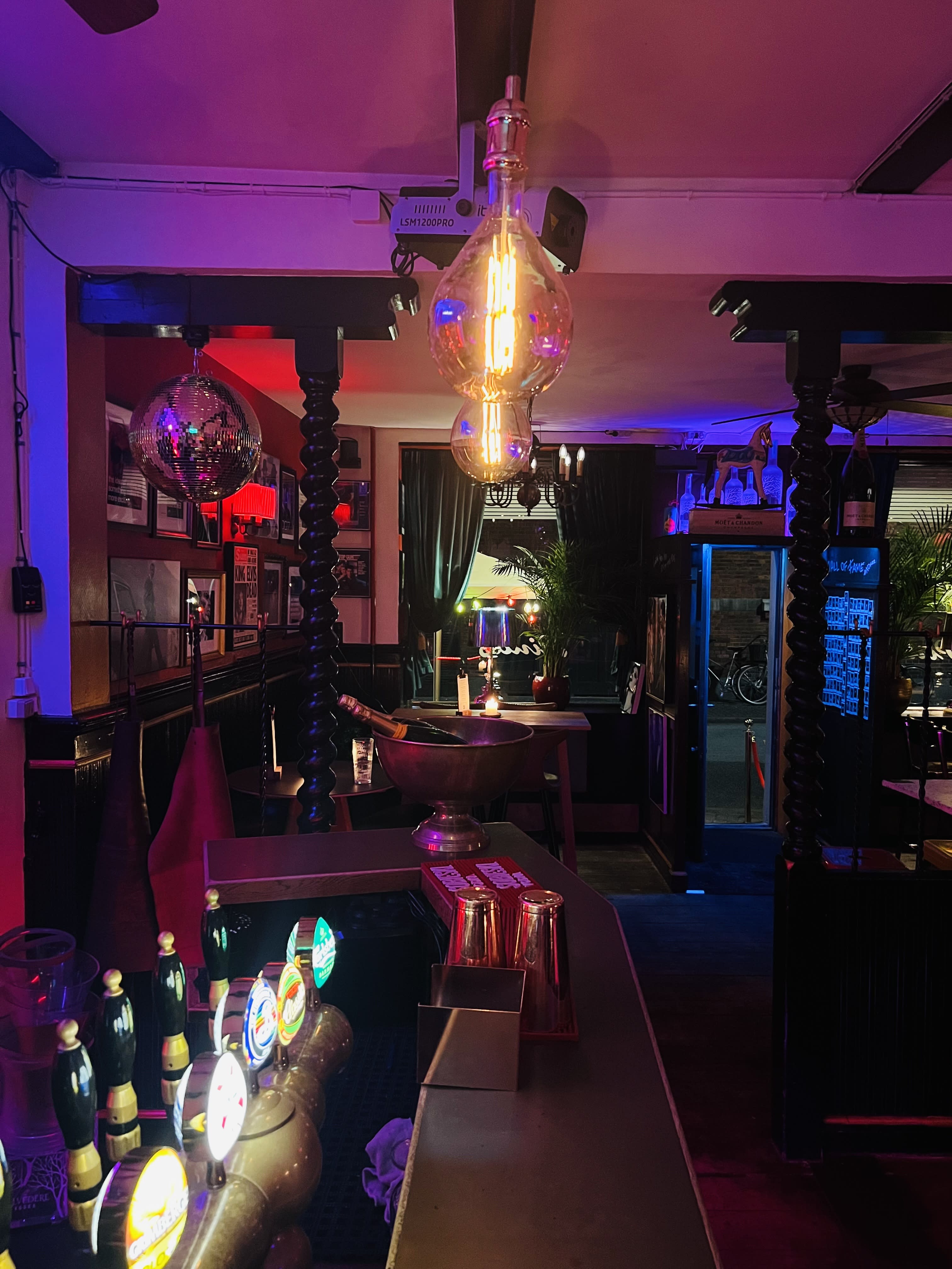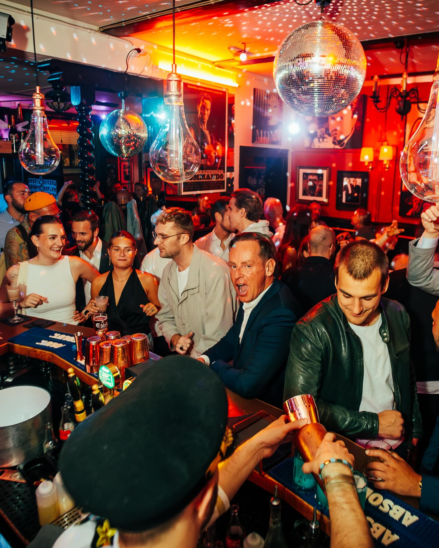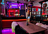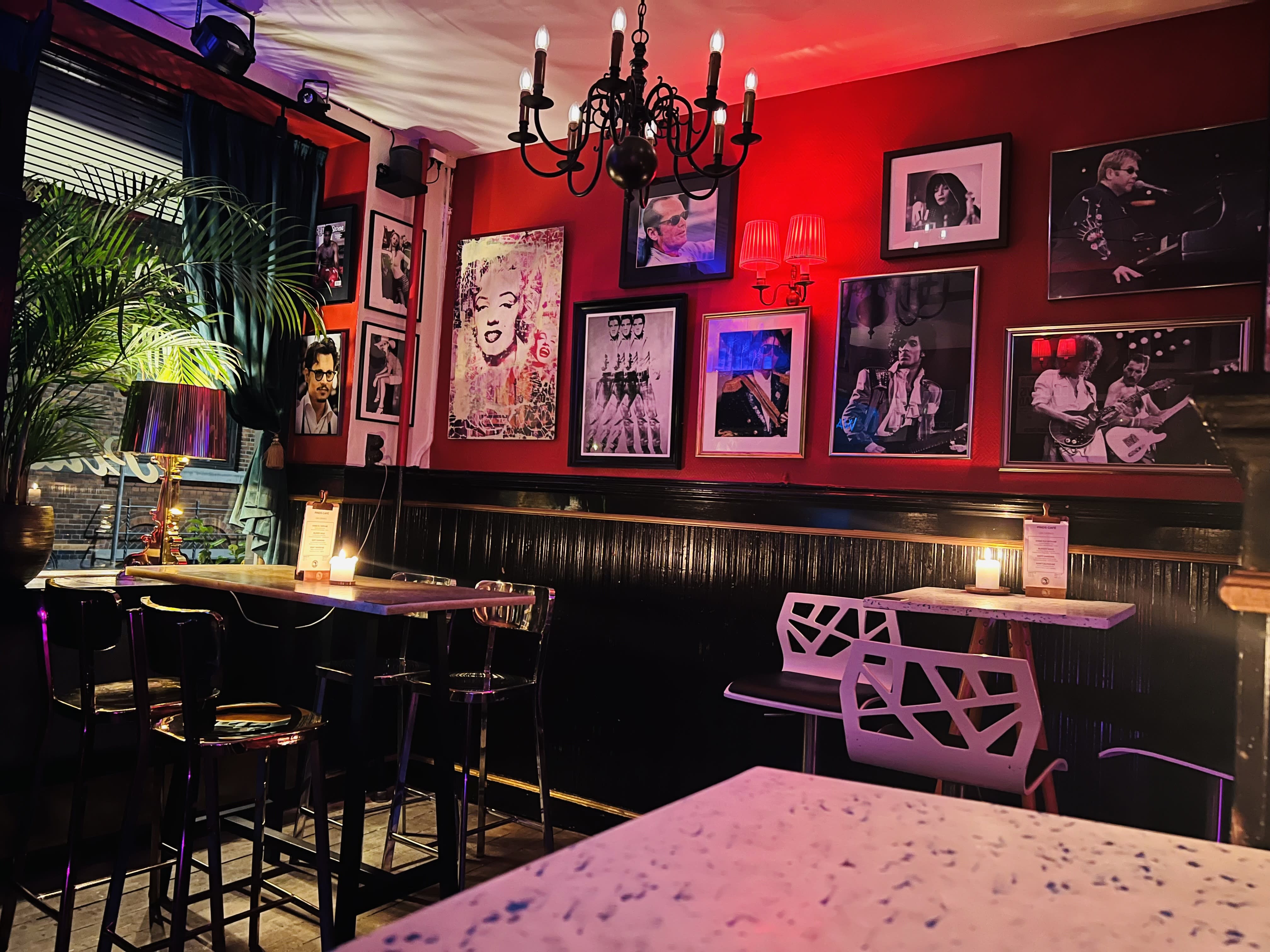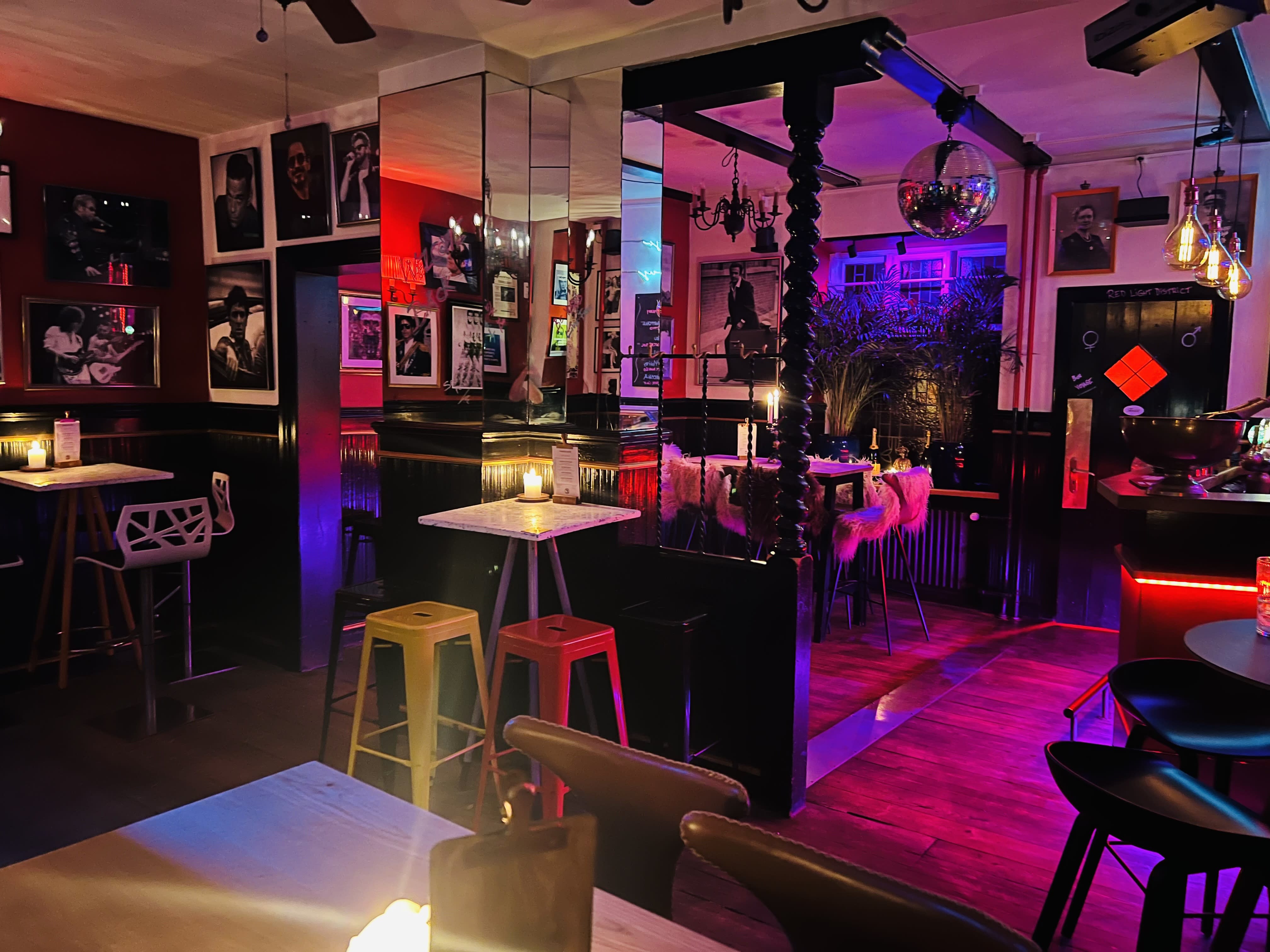 Indretningen emmer af retro amerikansk charme med LED-skilte, nostalgiske plakater og en kombination af sorte lædersofaer og farvede stole, der skaber kontrast til de rødmalede vægge. Når aftenen falder på, kan belysningen dæmpes, og neonlys i lilla og røde nuancer tændes for at skabe en eksklusiv og opløftende atmosfære, der transporterer jer tilbage til de swingende 60'ere. Denne unikke setting gør det muligt at gå direkte fra præsentationer til fest og fra strategimøder til socialt samvær.