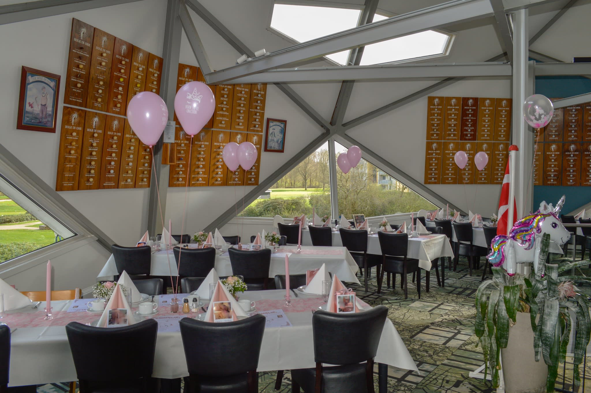 Restaurant Kuplen byder på to enestående selskabslokaler, der danner perfekte rammer for enhver festlig anledning. "Kuplen" er et arkitektonisk mesterværk med sit imponerende kuppelformede design og asymmetriske vinduer, der skaber et fascinerende lysindfald og en unik atmosfære. Dette særprægede rum inviterer gæsterne til at udforske dets geometriske former og vinkler, hvilket gør det til en sand perle for dem, der søger noget ud over det sædvanlige. "Salen" tilbyder en mere klassisk elegance med sin åbne planløsning, hvide vægge og dekorative gulvtæppe, der skaber en rolig og indbydende stemning. Begge lokaler er udstyret med moderne faciliteter, herunder projektor og lydudstyr, og kan fleksibelt indrettes efter jeres ønsker. Ud over de indendørs faciliteter råder Restaurant Kuplen over en charmerende terrasse med en betagende udsigt over golfbanens velplejede græsplæner. Her kan I og jeres gæster nyde en velkomstdrink, trække frisk luft mellem retterne eller bare slappe af i de komfortable udemøbler. Med disse alsidige muligheder kan Kuplen tilpasse sig ethvert arrangement, hvad enten I drømmer om en intim sammenkomst eller en storslået fest.