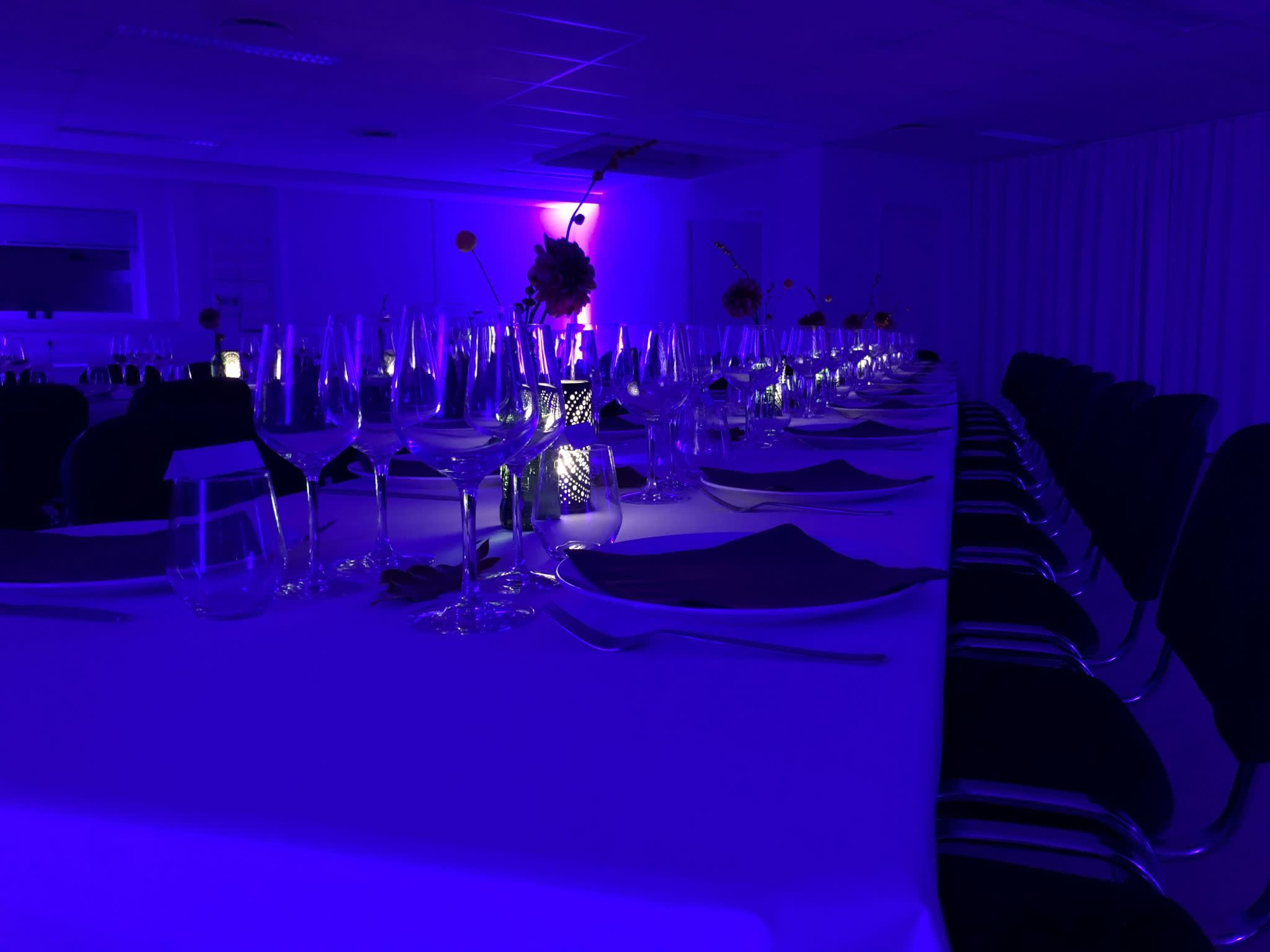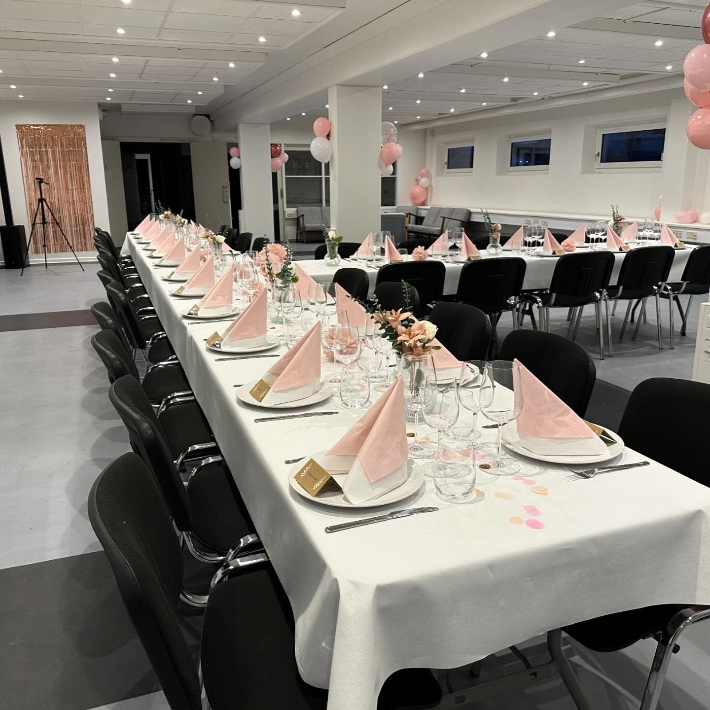 Bordene til lokalet findes bag gardinet i festsalen.