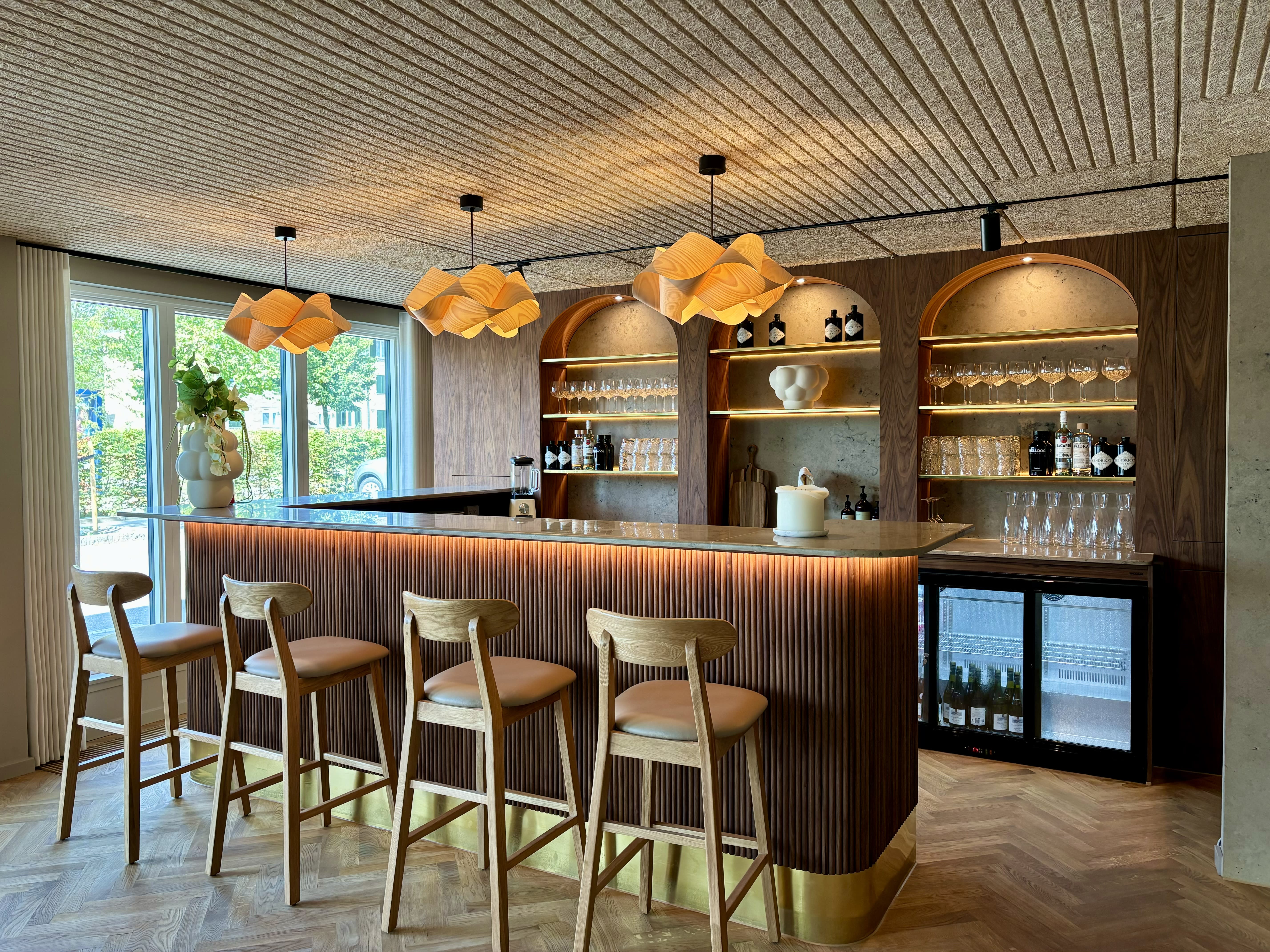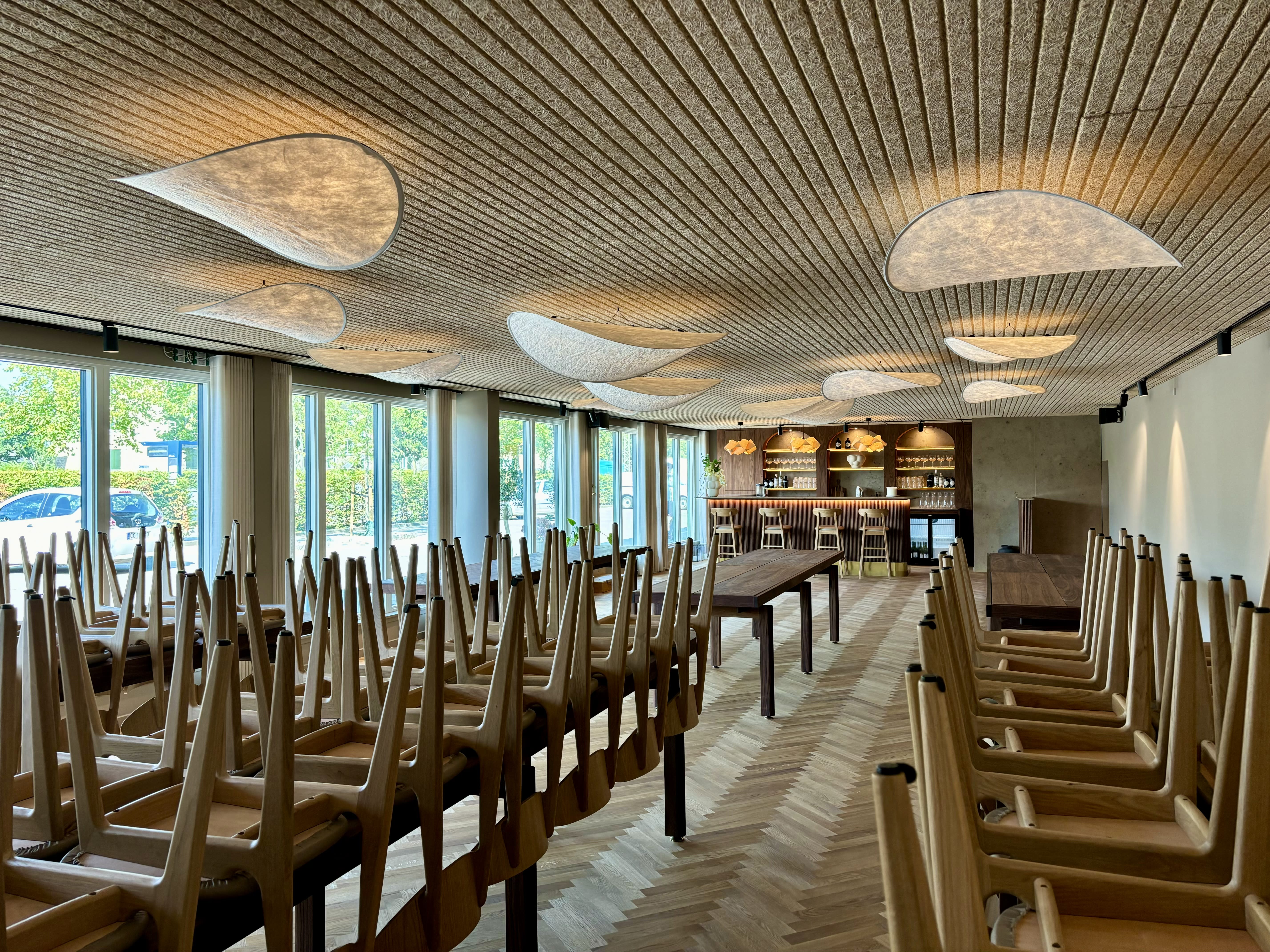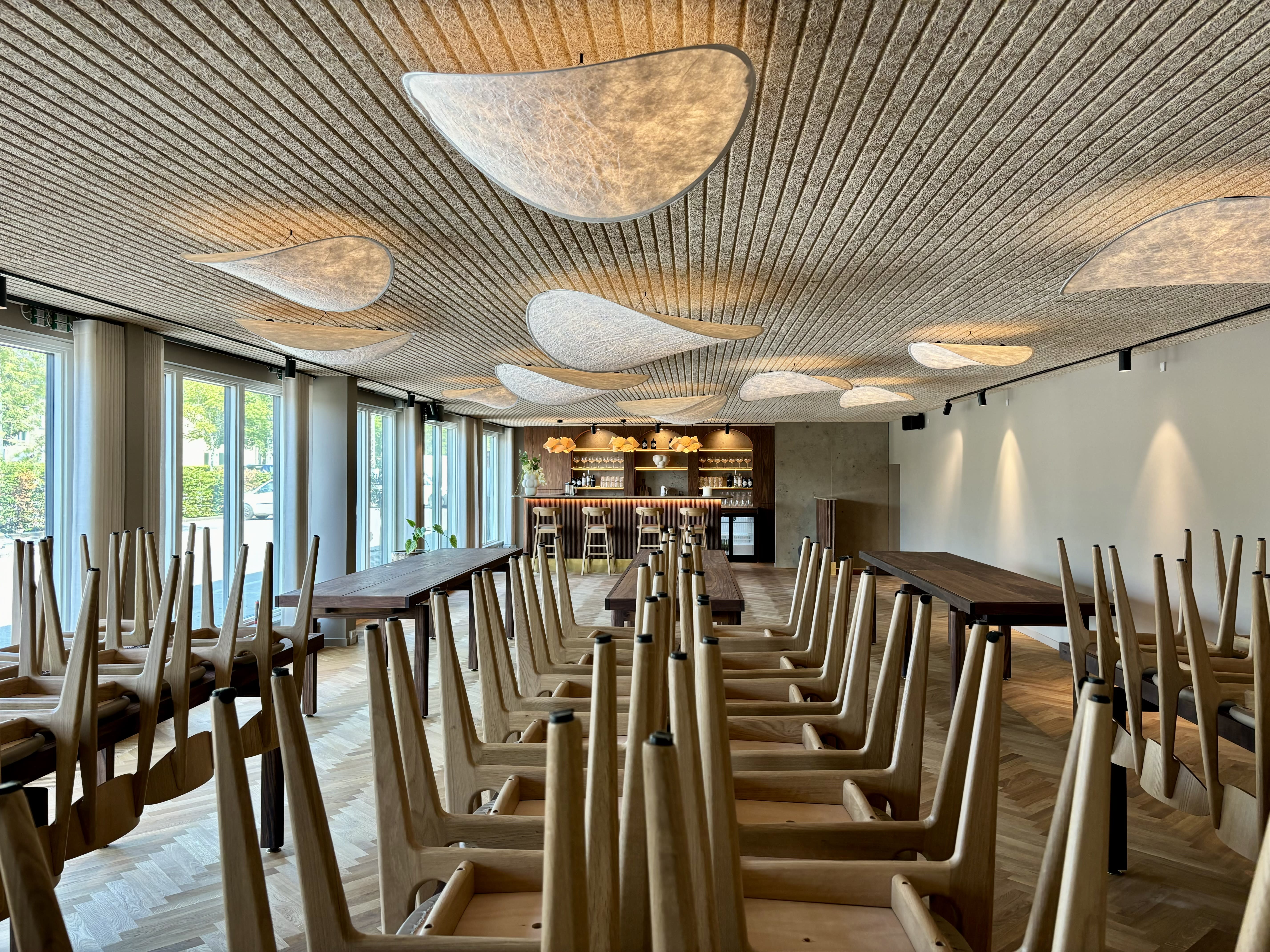 Shufflebar er indbegrebet af moderne skandinavisk design med en sans for detaljer, der skaber en unik kombination af æstetik og hygge. Det smukke sildebenparket, det spinkle træpanelsloft og de danske designerstole danner sammen med solide træborde og dekorative lamper en varm og rolig atmosfære. Store vinduespartier bryder de stramme linjer og lader det naturlige lys strømme ind, hvilket skaber en smuk kontrast i lokalet. Den elegante indretning træder frem, mens lyset og de smukke lamper giver rummet en helt særlig karakter. Shufflebars fleksible rumfordeling gør det muligt at tilpasse lokalet til ethvert arrangement, hvad enten det er intime selskaber eller større begivenheder. Topmoderne faciliteter sikrer, at jeres arrangement forløber gnidningsfrit fra start til slut.