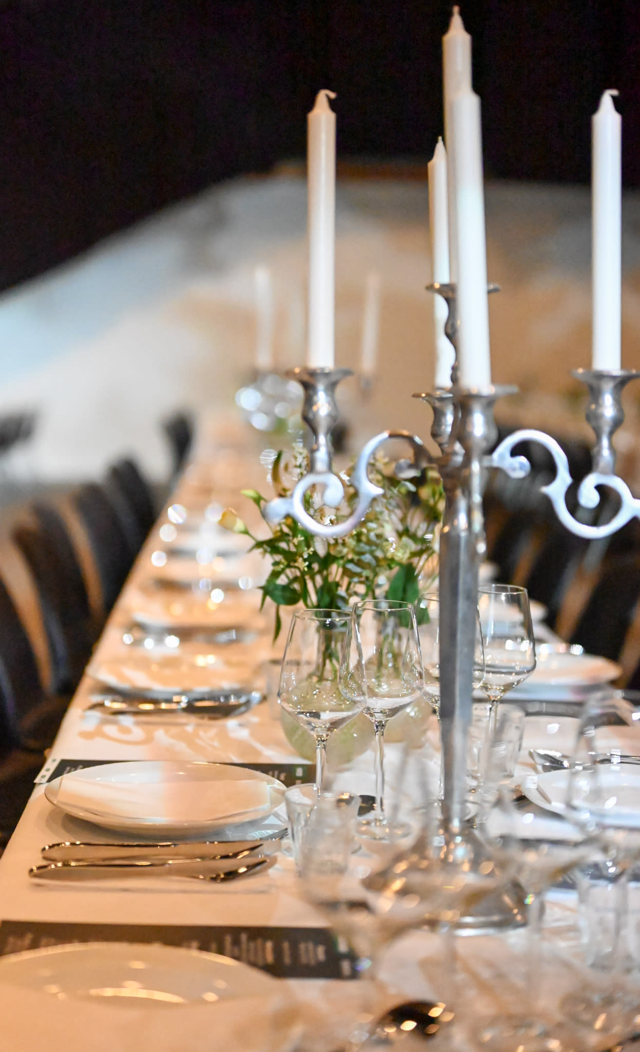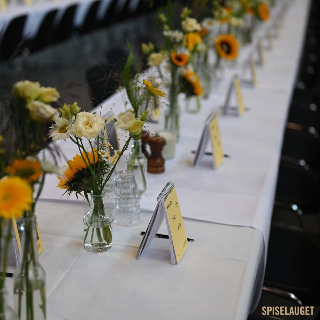 Opdækning ved lange borde med hvide duge og levende lys. Ved yderligere udsmykning/pynt udregnes tilbud på opsætning og eventuel varighed af forlængelse af lokaleleje ud fra behov og ønsker.